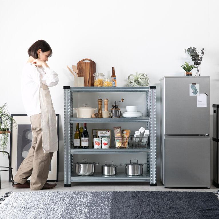 こちらのスチール シェルフは抜け感があり、アルミ収納ケースと組み合わせることで統一感が生まれ、ものも隠しながらも落ち着く部屋にできます。