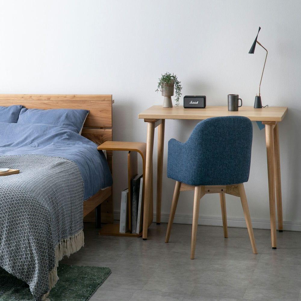 木目調のナチュラルな色味が部屋になじむデスクは、気分を落ち着かせてくれます。広々とした天板が、寝る前のもうひと仕事や趣味の時間を彩ります。
