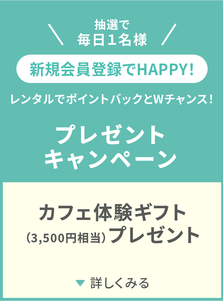 ●ポイントバックキャンペーン及び、参加賞で付与するポイントは、当社サービスにおける商品のレンタルに際して1ポイント=1円相当額として利用できるものとします。お客さまは、ポイントを当社が指定する当社サービスにおける商品レンタルの料金支払い以外の、現金、財物その他の経済的利益と交換することはできません。また、当社は理由のいかんを問わず、一切ポイントの払戻しをいたしません。その他ポイントの取扱いについては、利用規約のほか当社が別途定める内容によるものとします。