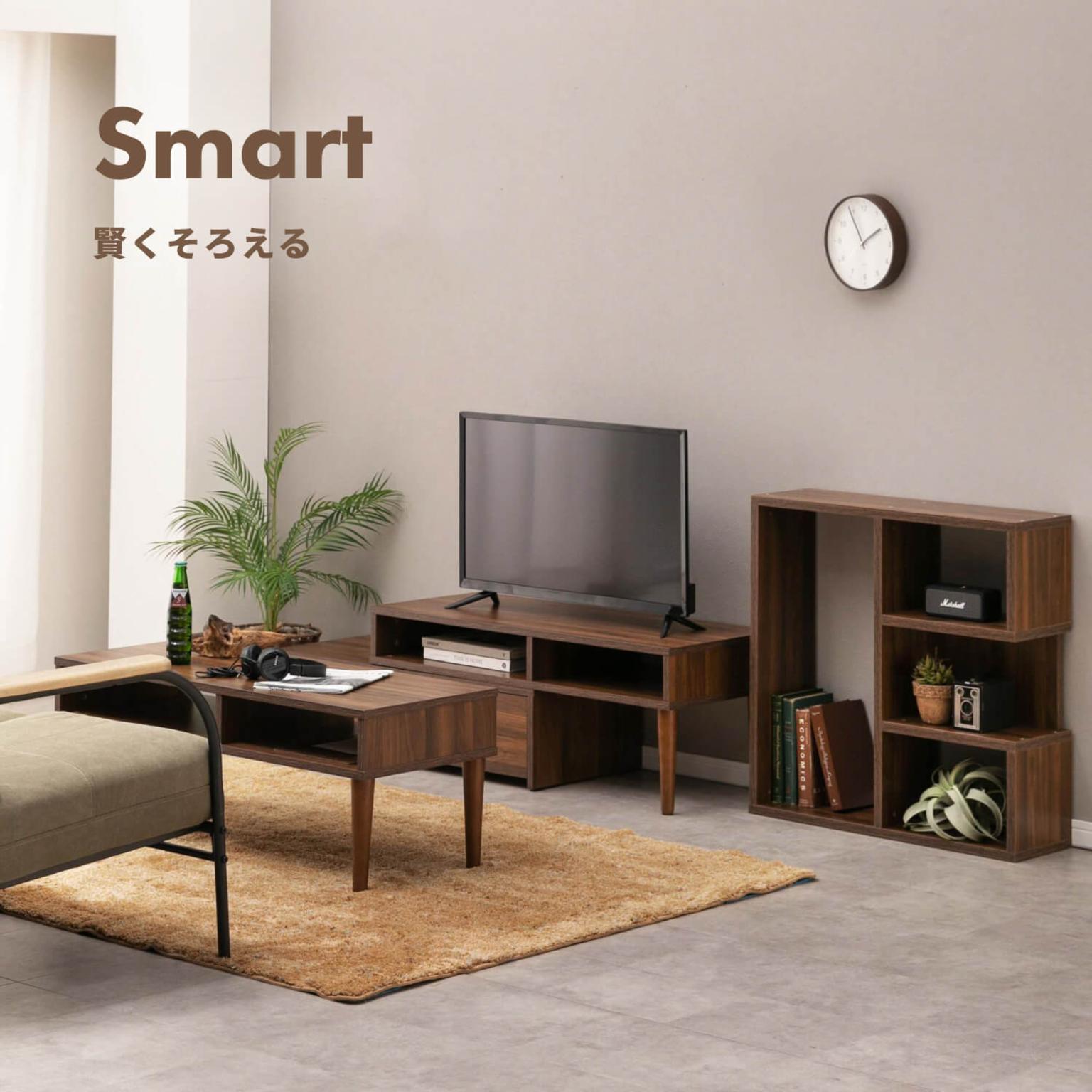 すっきり置けるオープンシェルフ。センターテーブルと同色をチョイスしてまとまりのある空間に。