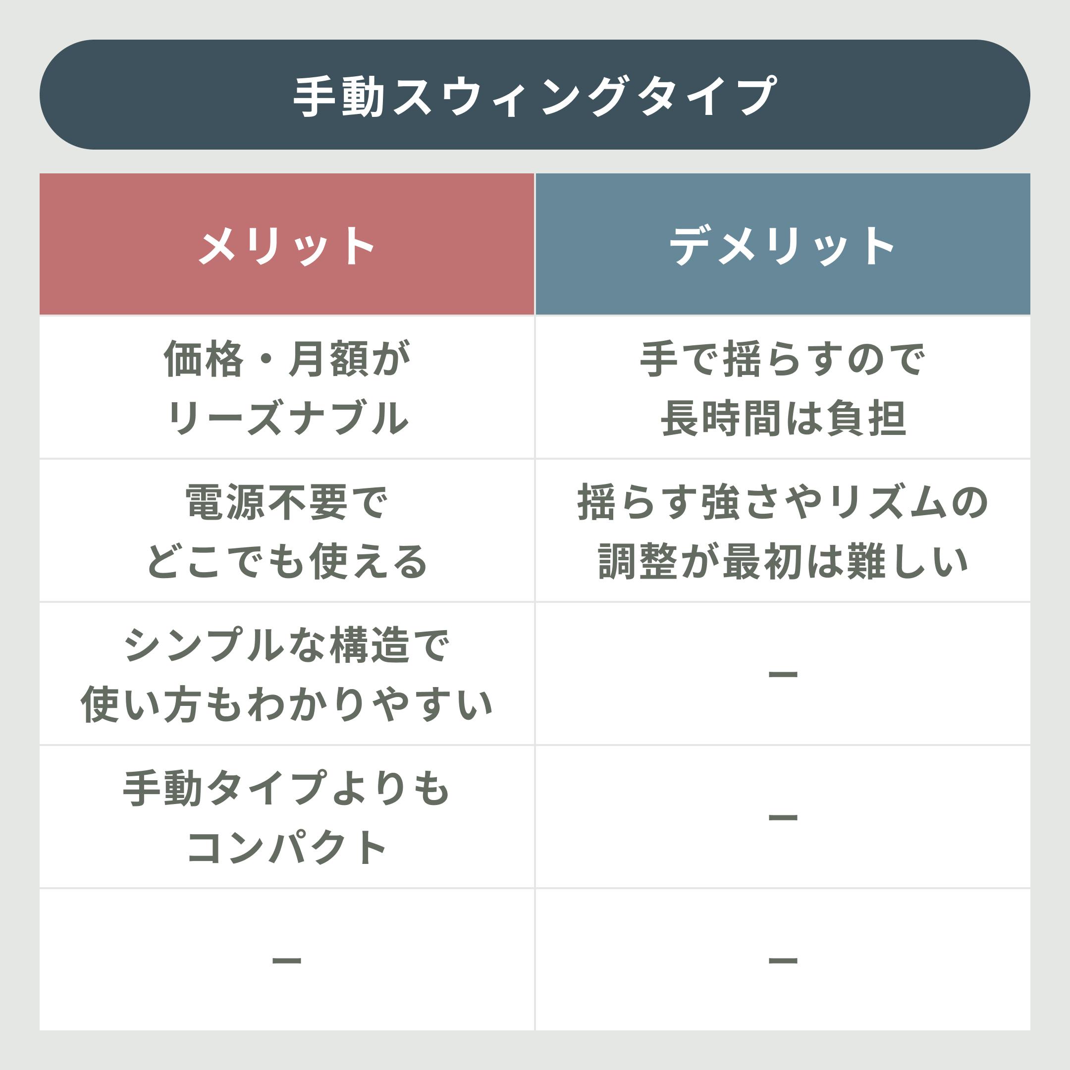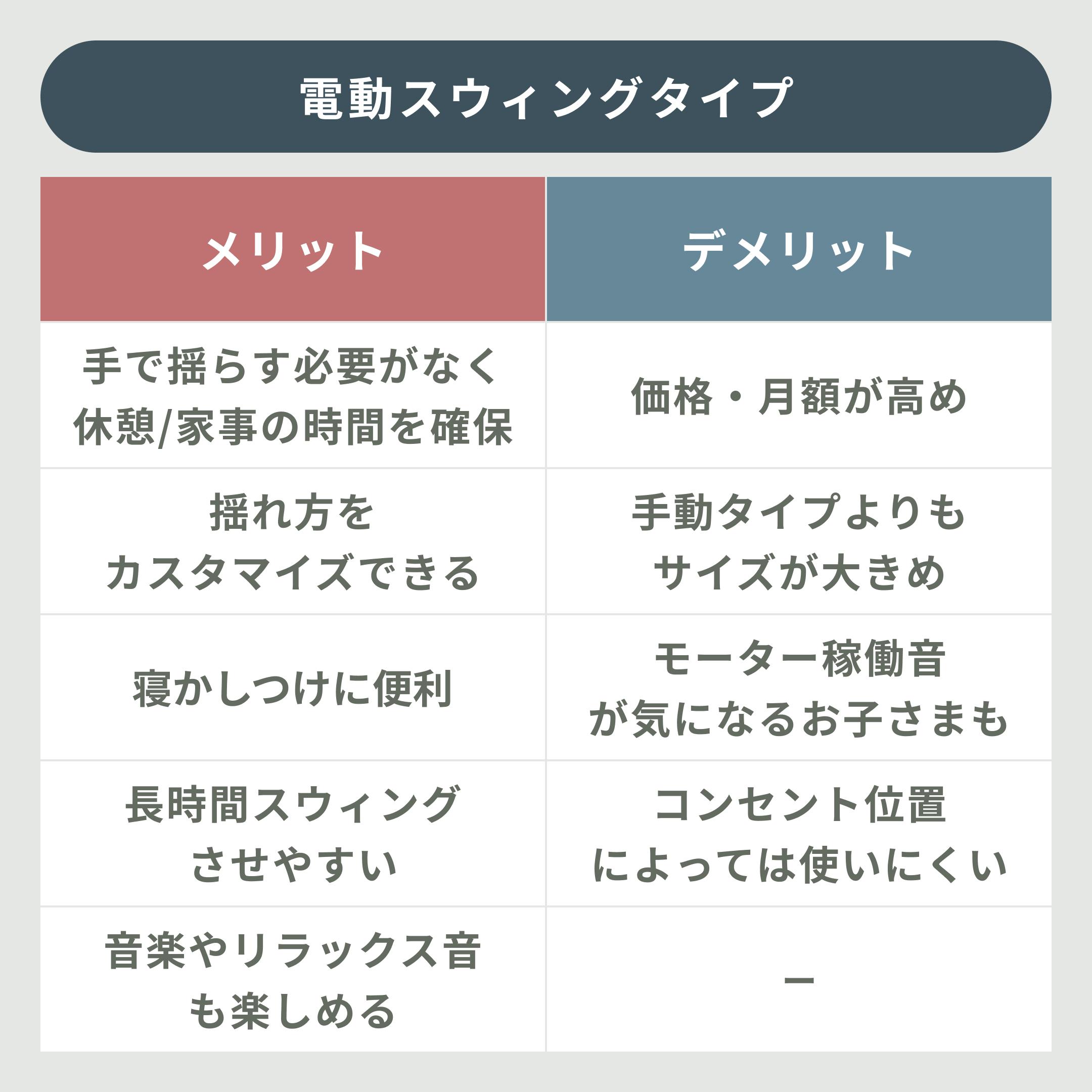 ママ・パパの手を使わずに自動でお子さまに優しい揺れを提供する「電動タイプ」のメリット・デメリットは以下の通りです。