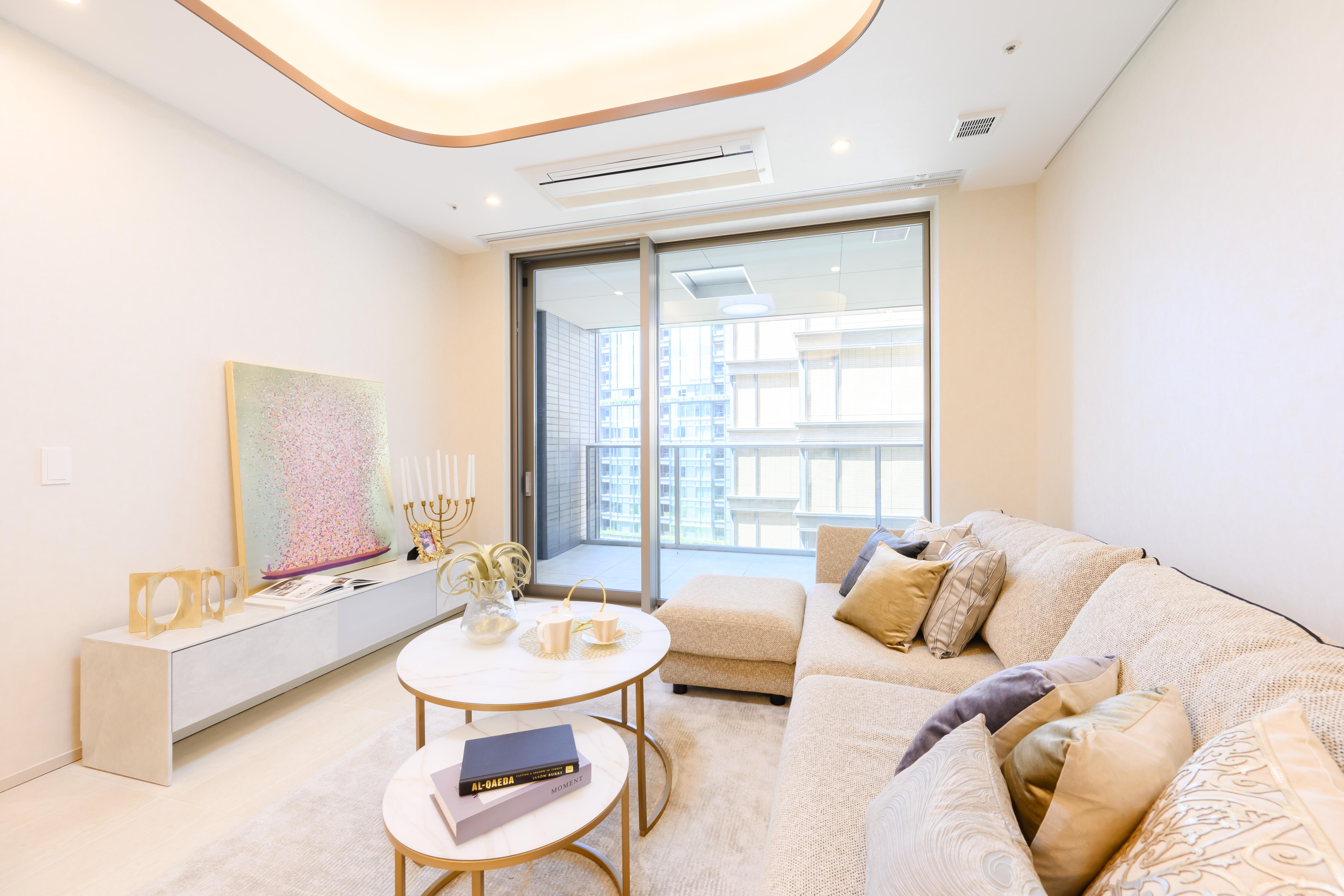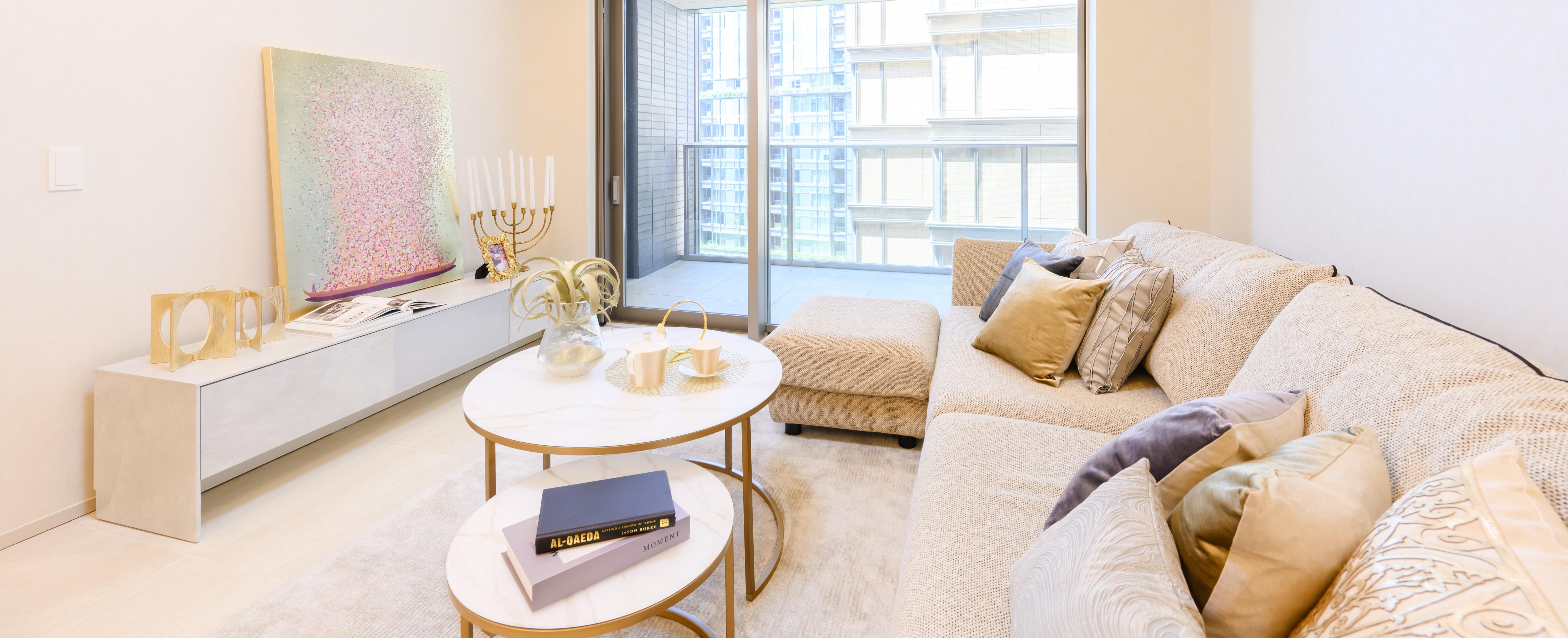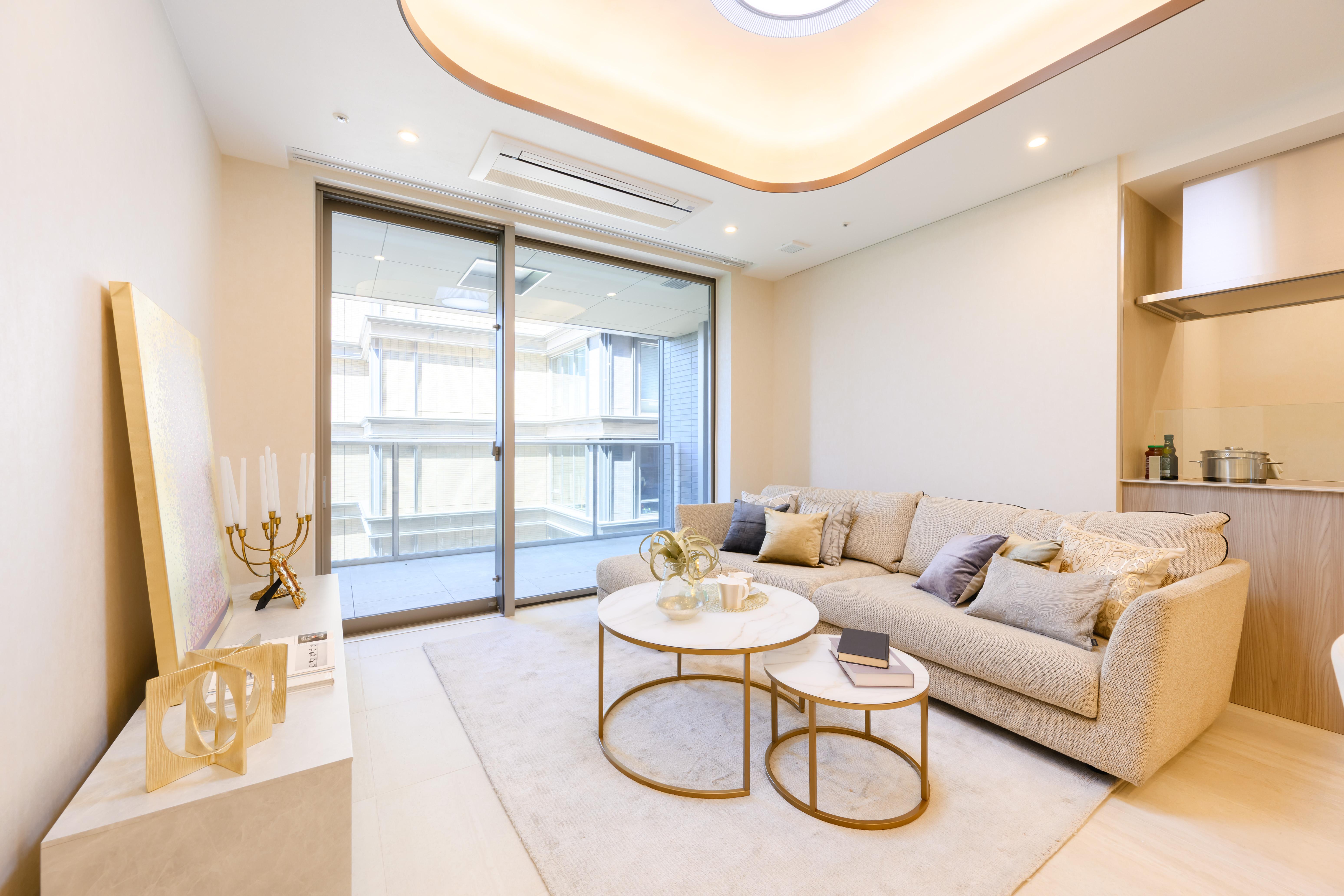 窓からの光を余すところなく受け止めるように、低めのソファを配置しました。滑らかな鏡面素材のローテーブルが、光をやわらかく反射してリズムを生みます。シャンパンゴールドのアートフレームを加えることで、上品な華やかさをプラス。麻布十番の都会的な夜景を映すガラス面の輝きが、まさに日常に魔法をかけるような空間に仕上がっています。