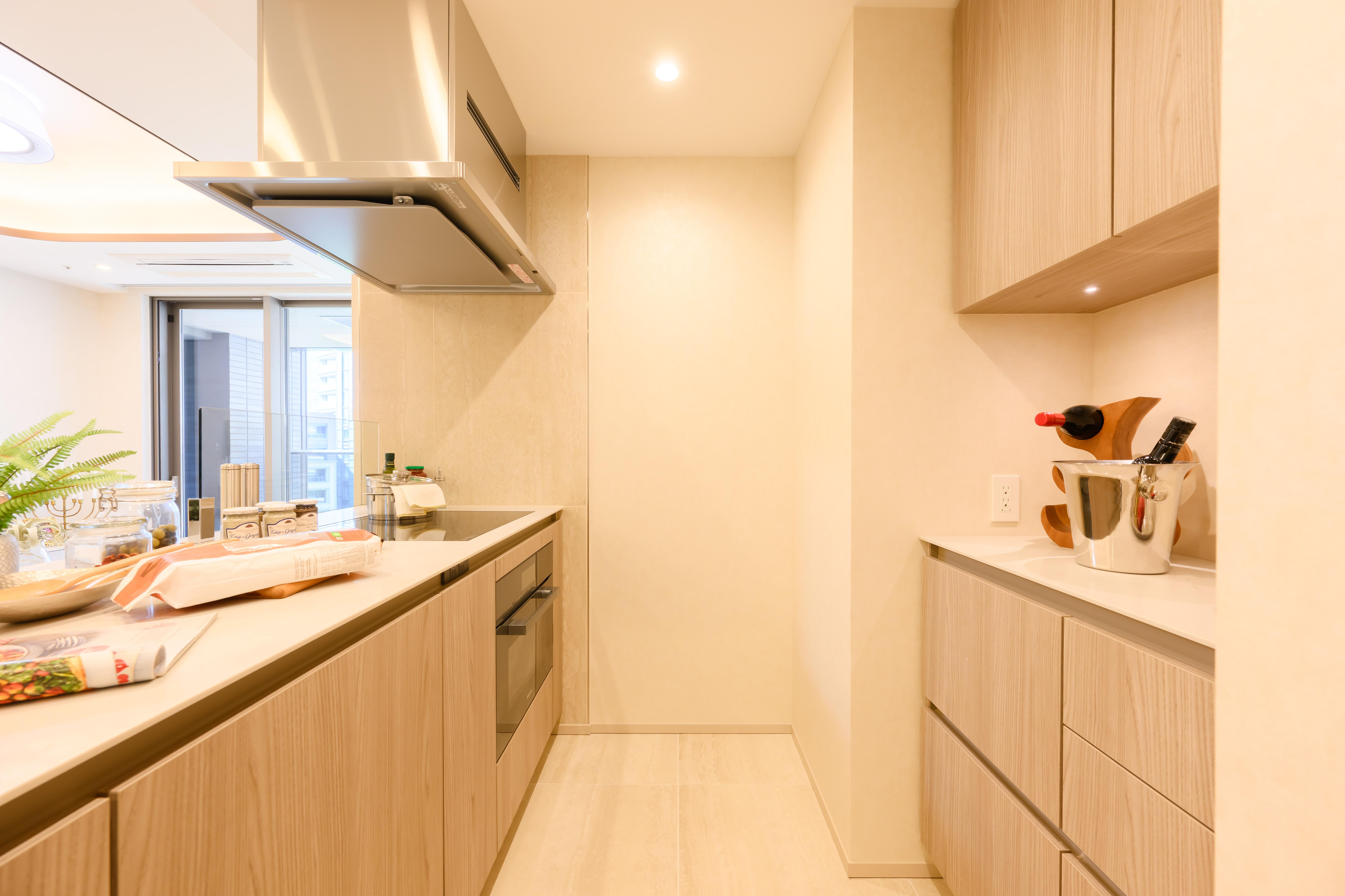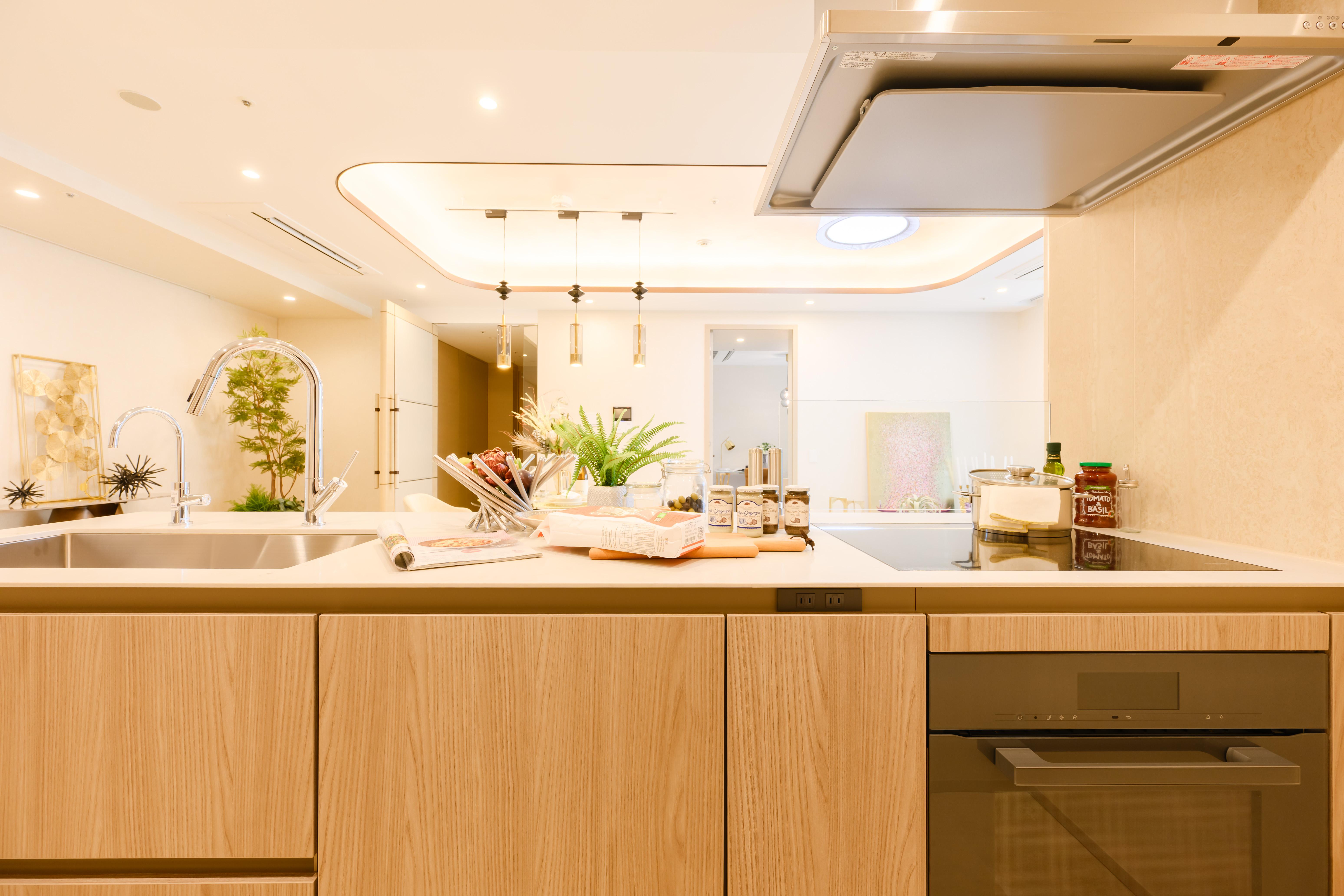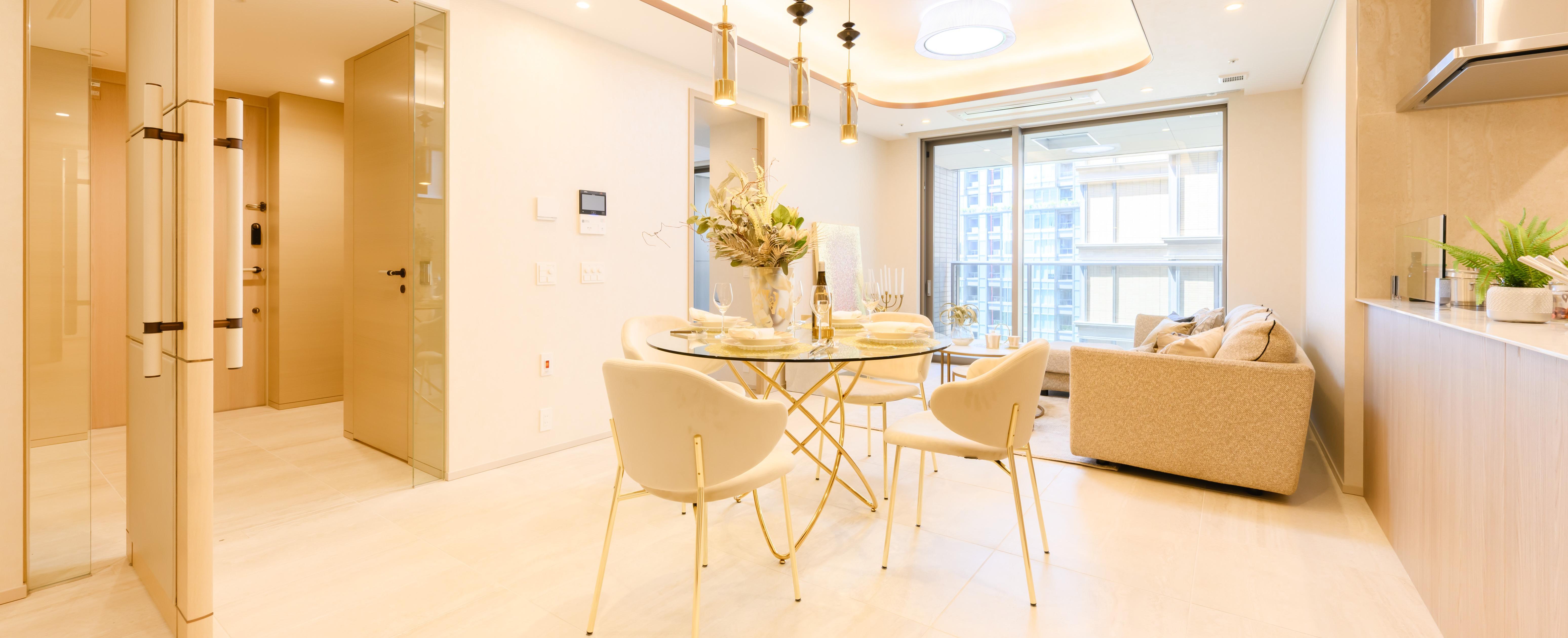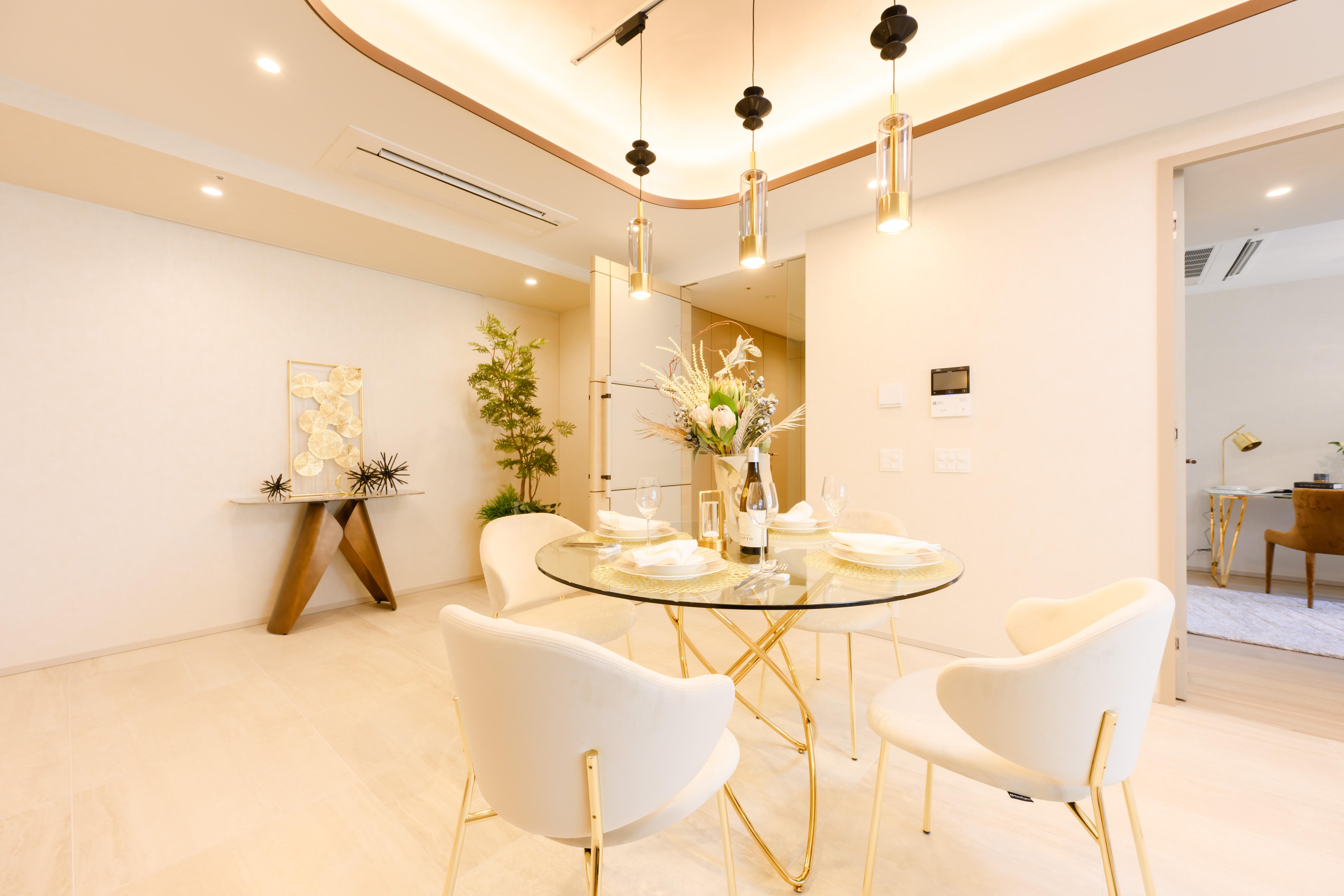 円形のダイニングテーブルを中心に、家族やゲストが自然と向かい合えるレイアウトに。ガラスペンダントライトがテーブル上にきらめきを落とし、会話を包み込むような柔らかい明かりを演出します。メタリックな小物をさりげなく添えて、華やかさの中にも品を感じる大人の食空間に。駅近という立地を生かして、気軽に友人を招ける都会のおもてなしダイニングです。