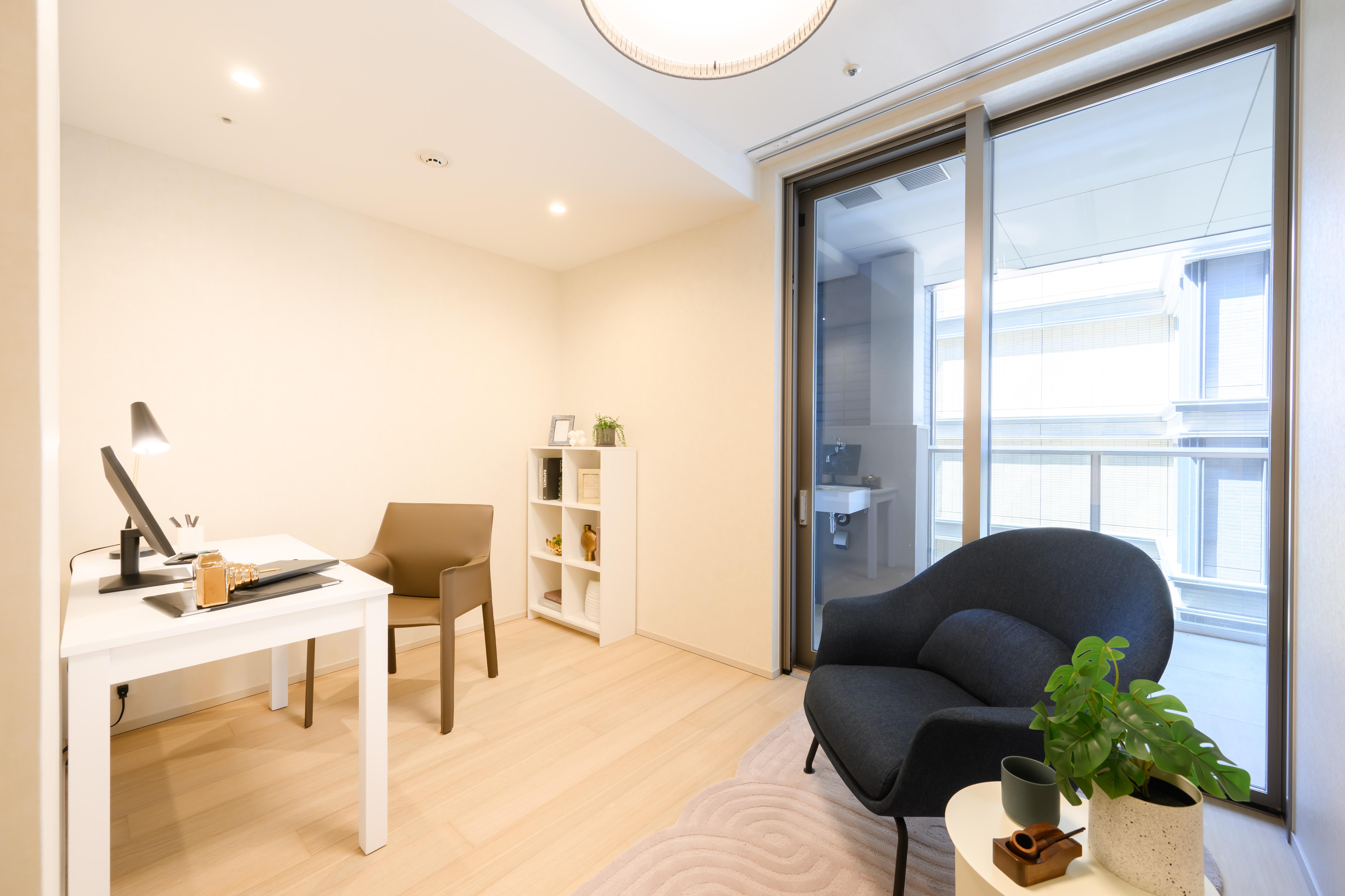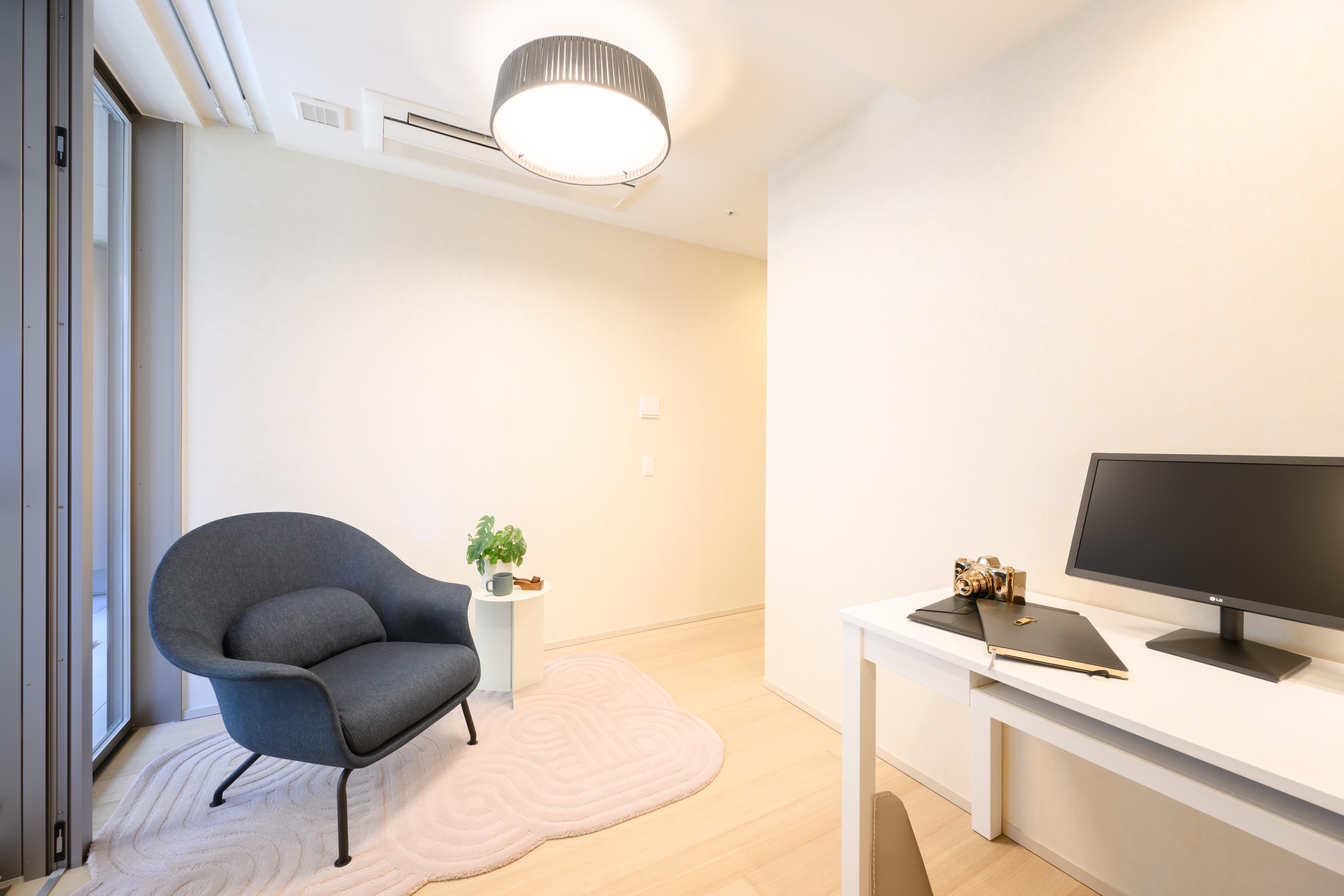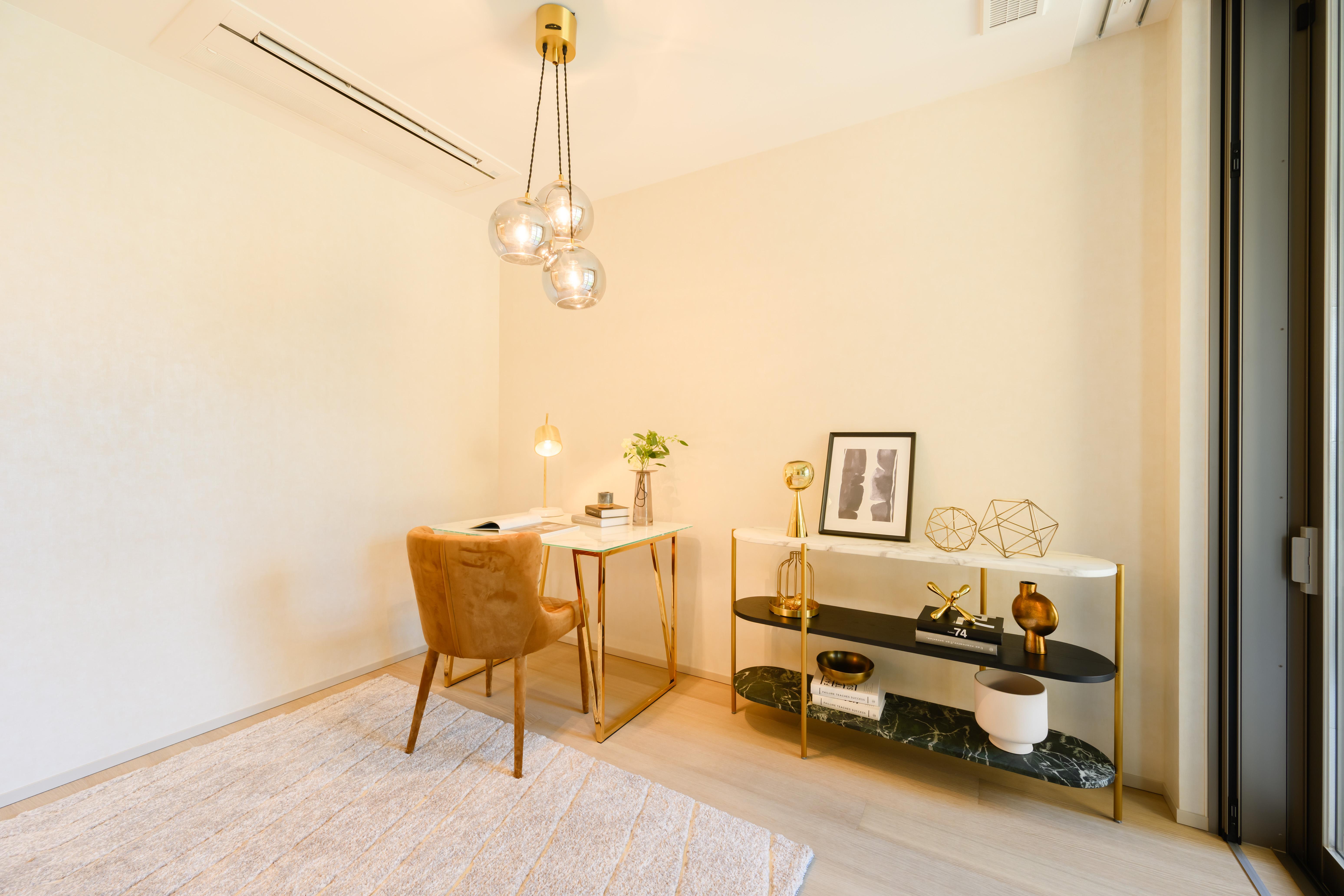 ワークデスクを中心に据えたこの空間は、集中とリラックスを両立するデザイン。デスク横にはラウンジソファを配置し、思考を休める時間も大切にしています。メタリックなデスクライトとミニマルなシェルフが、整然とした印象を与えながら、住まい全体の統一感もキープ。ビジネスエリアにもアクセスしやすい立地にふさわしい、洗練された都会の書斎です。