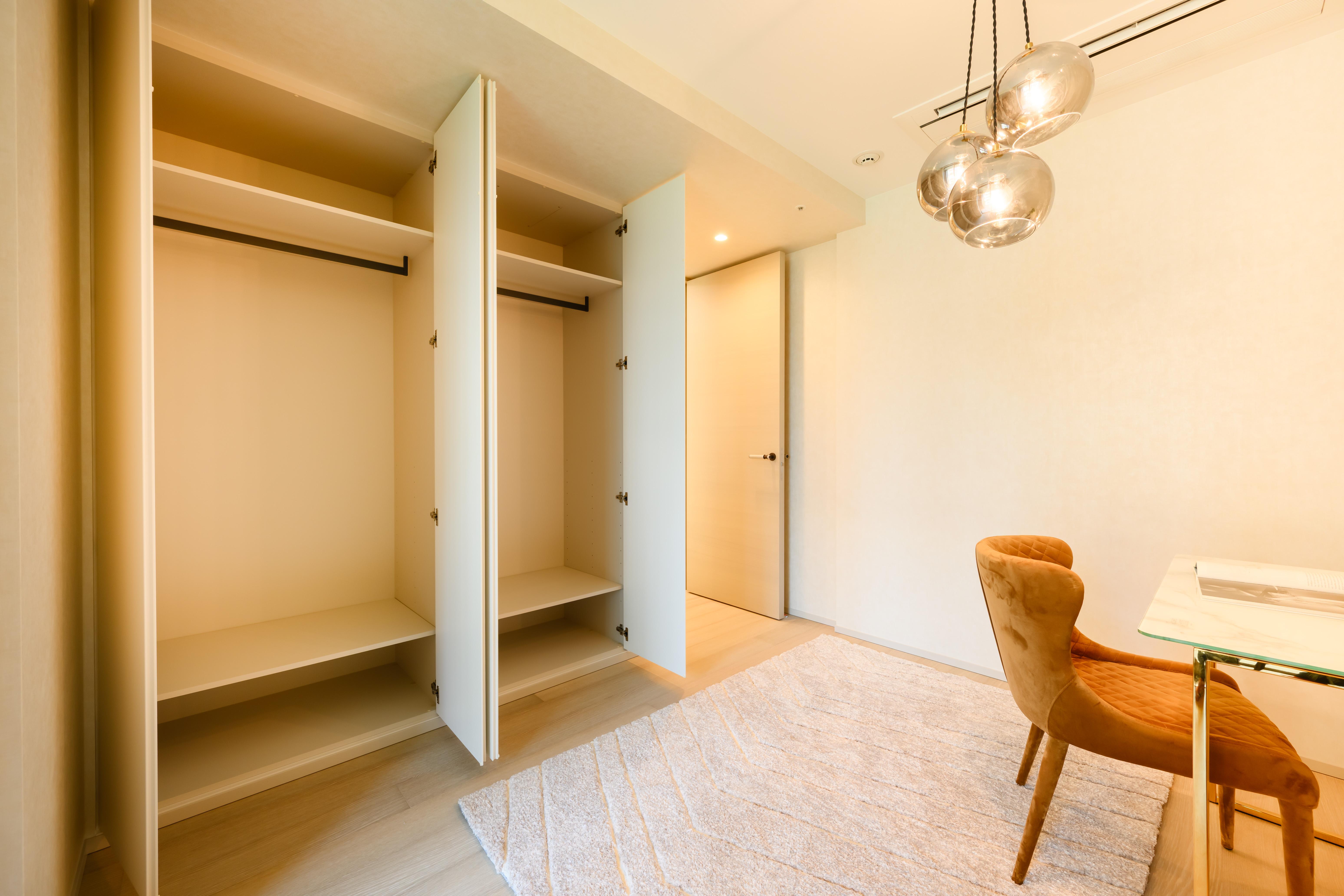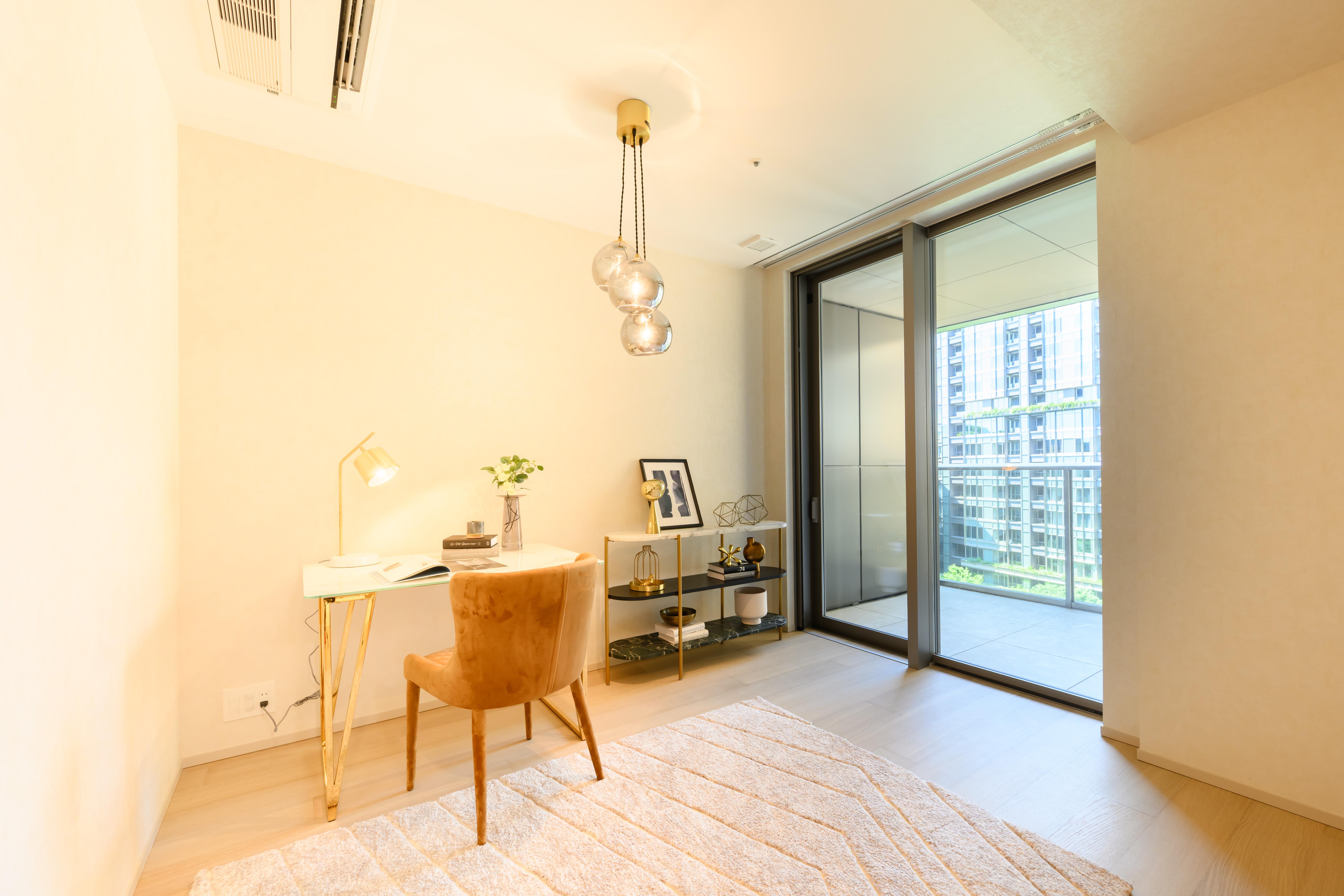 デスクとシェルフを中心に、静かに自分の時間を楽しめるスペースに。ラグジュアリーな光沢をもつラグと、シャンパンゴールドのアクセントが、穏やかな中に女性らしい華やぎを添えています。鏡面仕上げの小物をプラスすることで、部屋全体に光の粒が広がり、麻布十番らしいエレガントな世界観を完成させました。