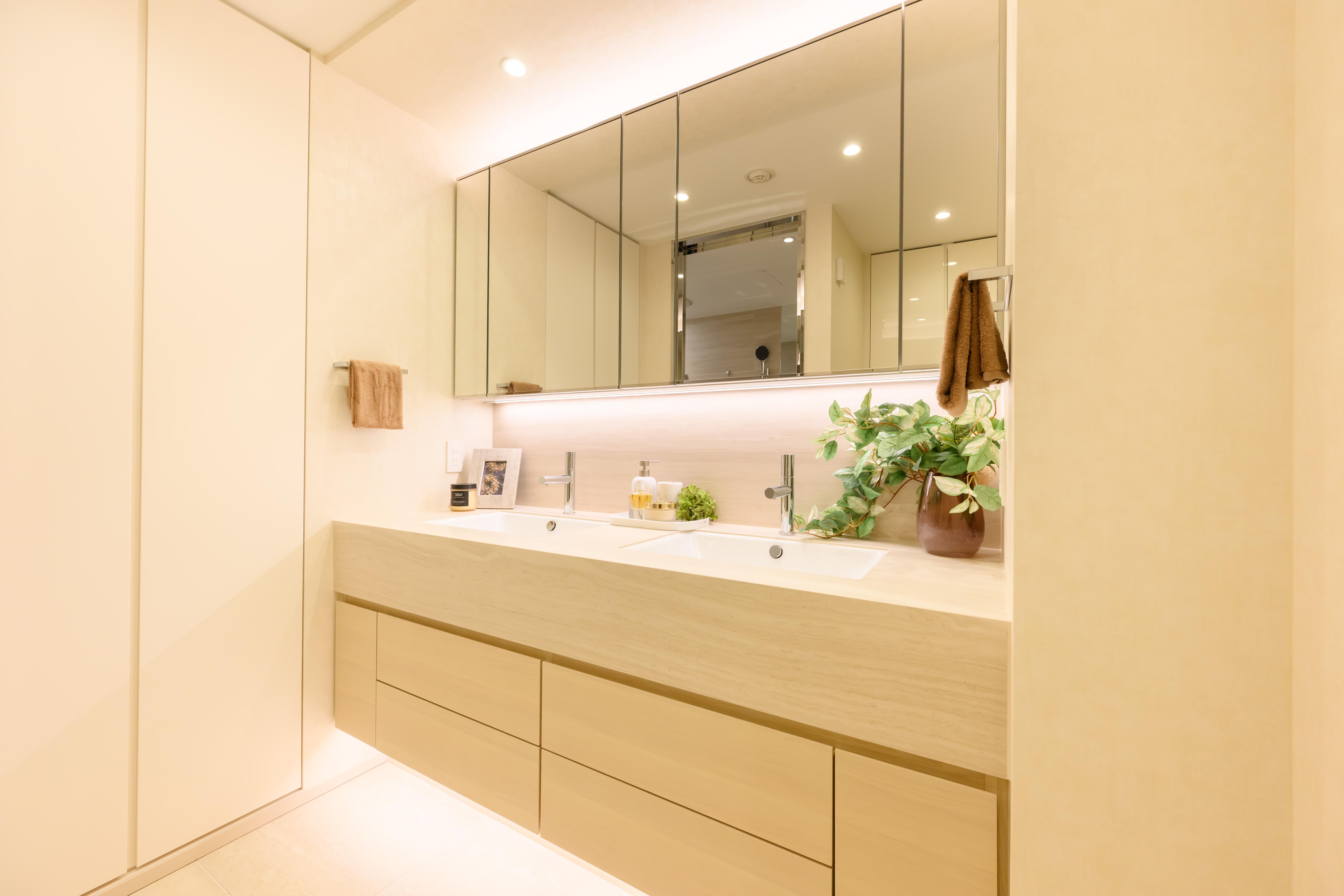 白とシルバーを基調に、クリーンさと上品さを兼ね備えた空間に。ガラスやメタルの質感が清涼感を演出し、朝の支度時間にも少しのときめきを感じられます。照明はあえて柔らかく拡散させ、光のきらめきが壁面に優しく広がるように設計。日常の中に、小さなラグジュアリーを感じられる場所です。