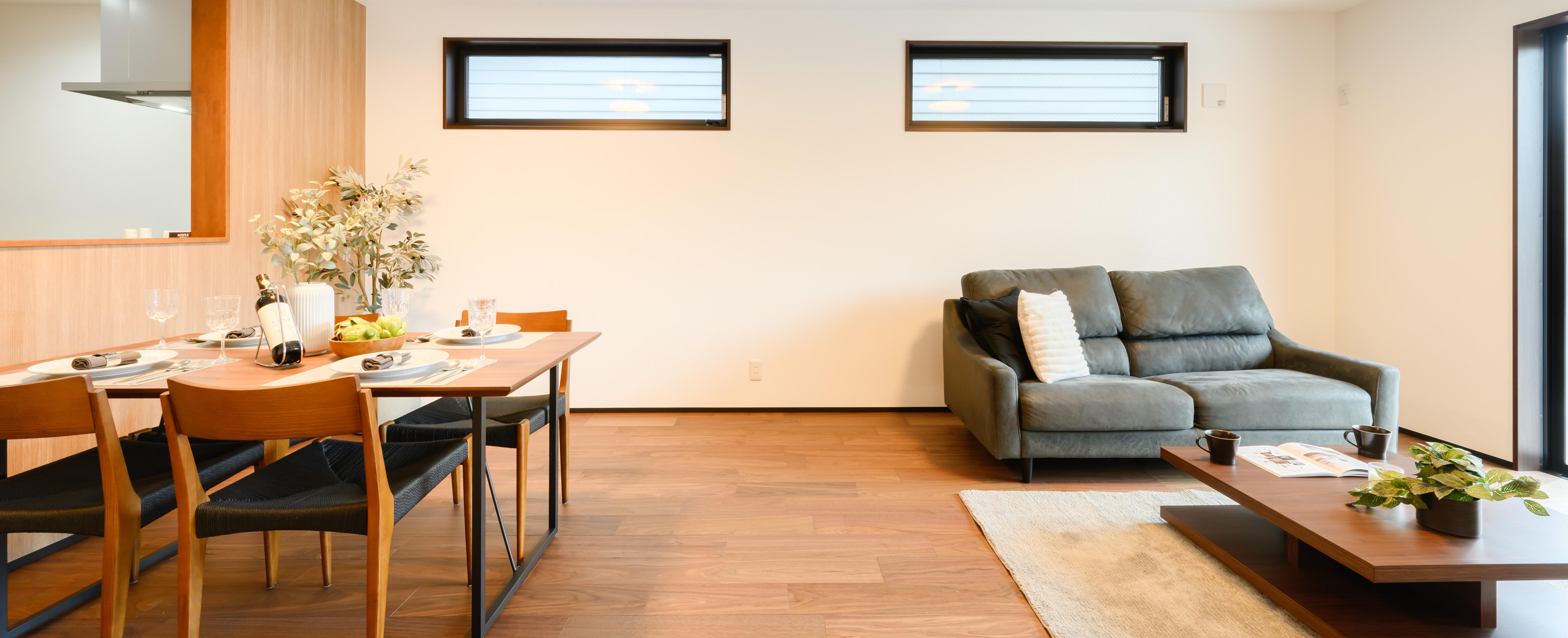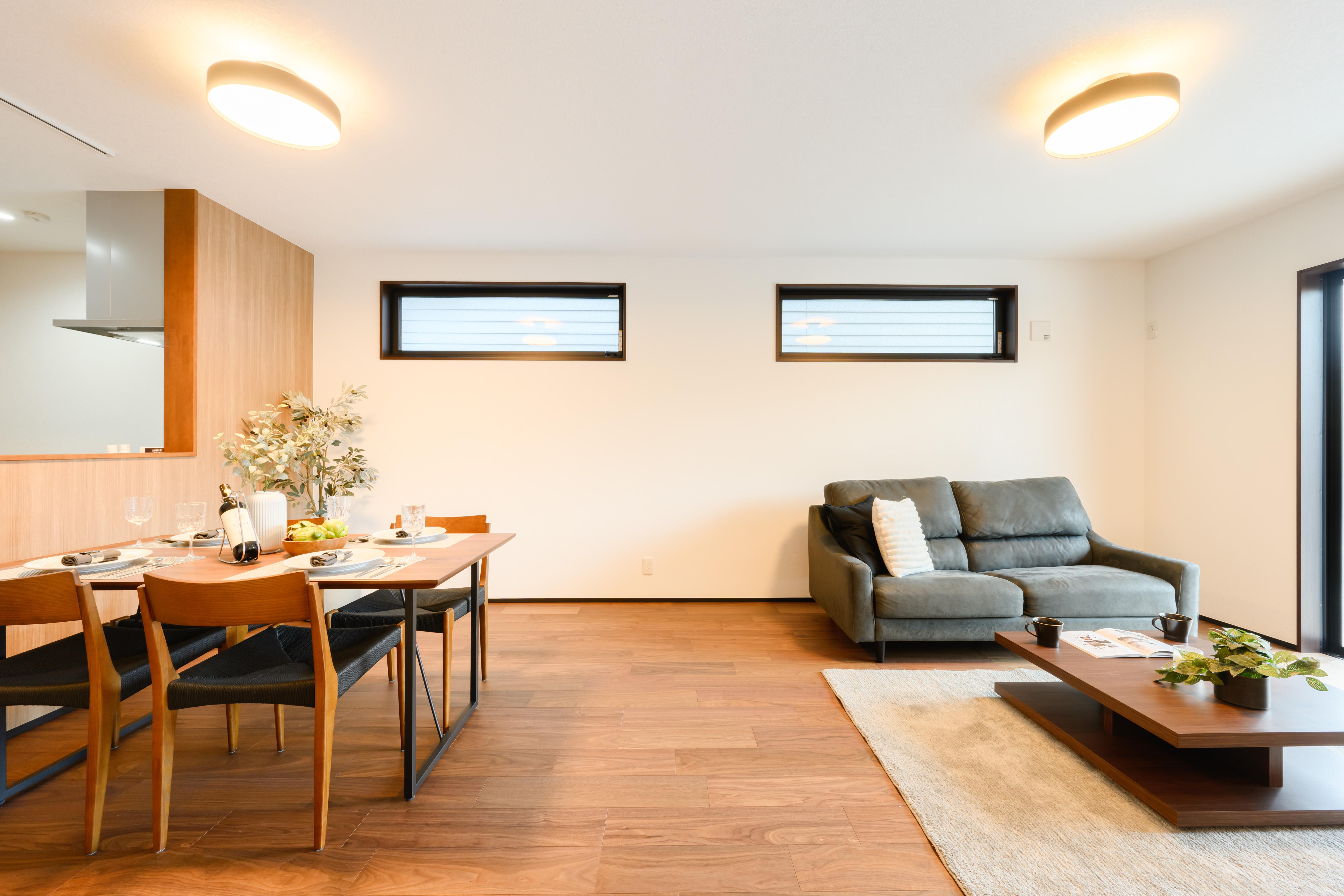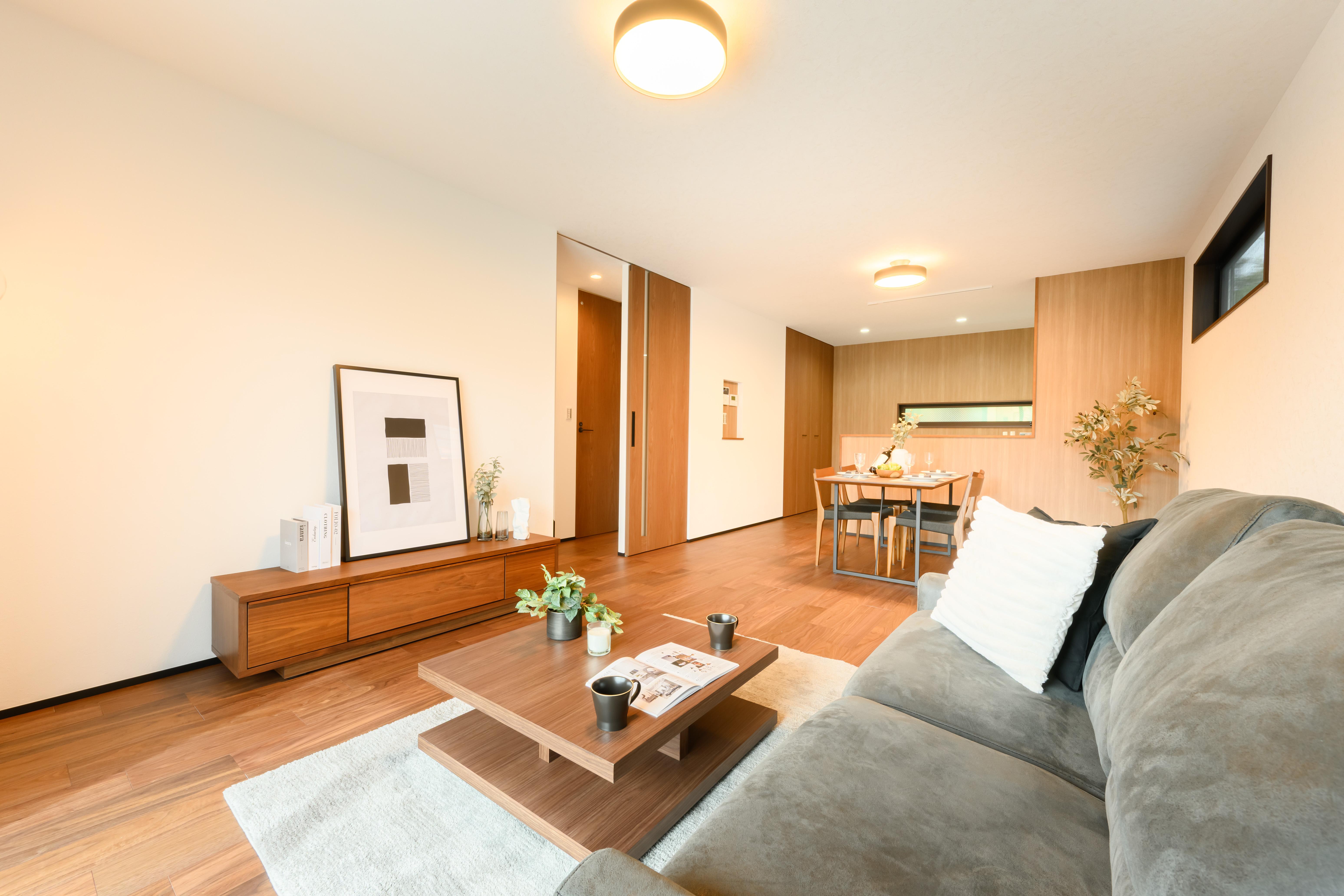 低めのソファとローテーブルを組み合わせ、視線が抜けるように設計。外装や建具のトーンに合わせ、ウォールナット×グレーで統一し、ダークグレーの外観にも自然に馴染みます。