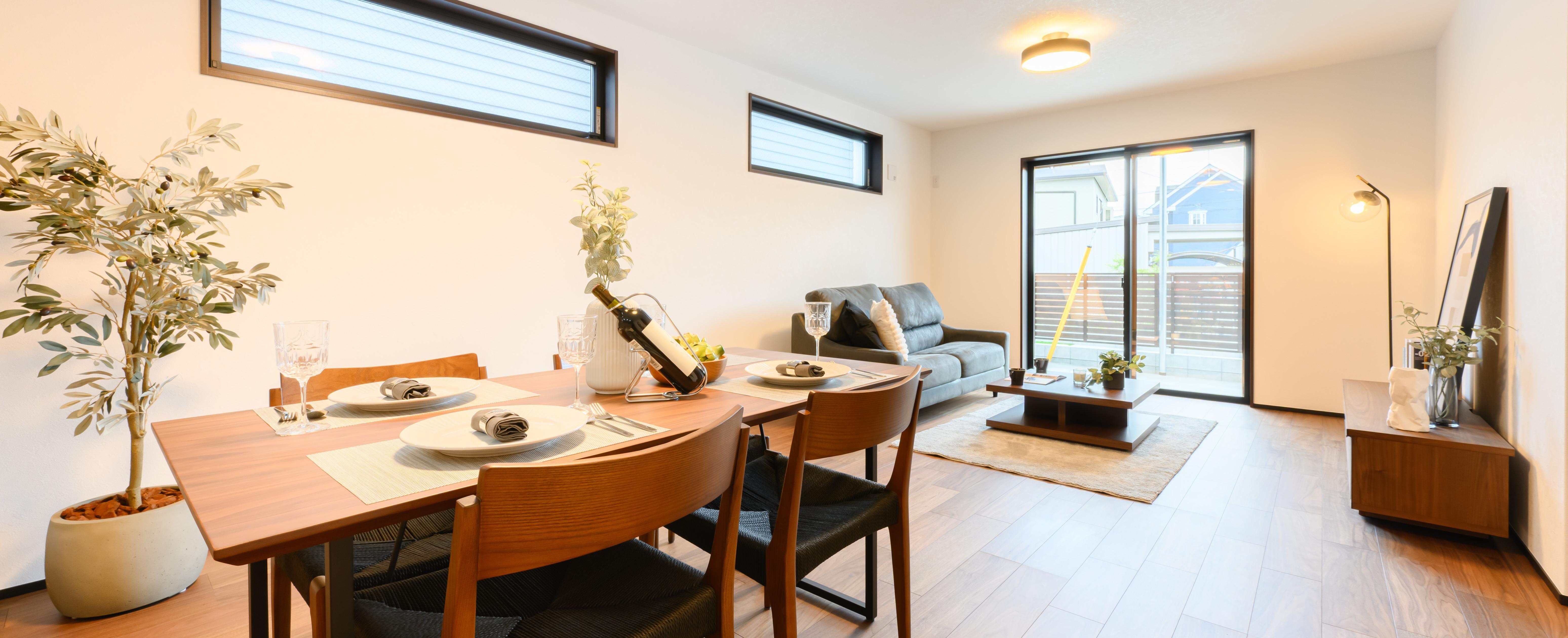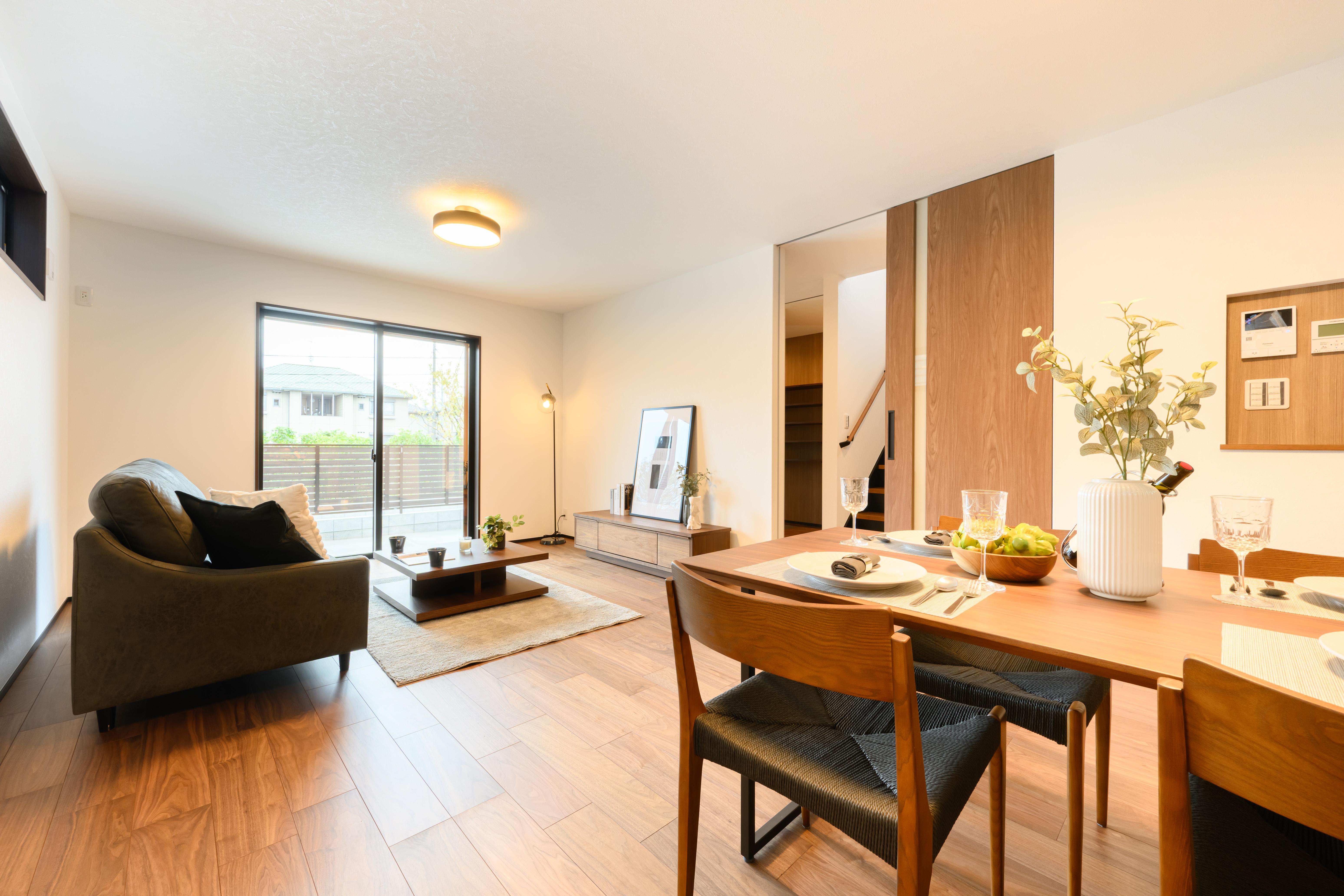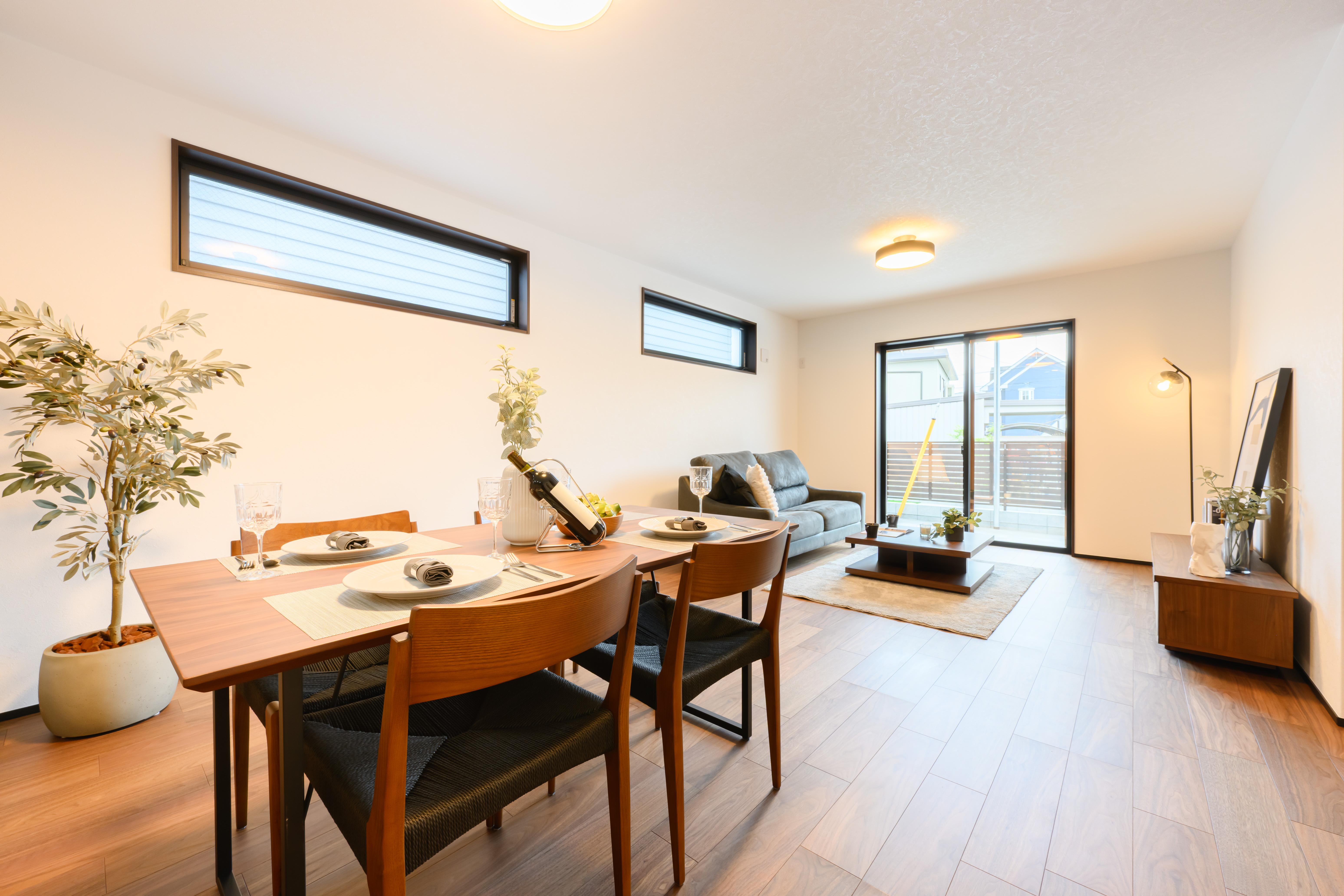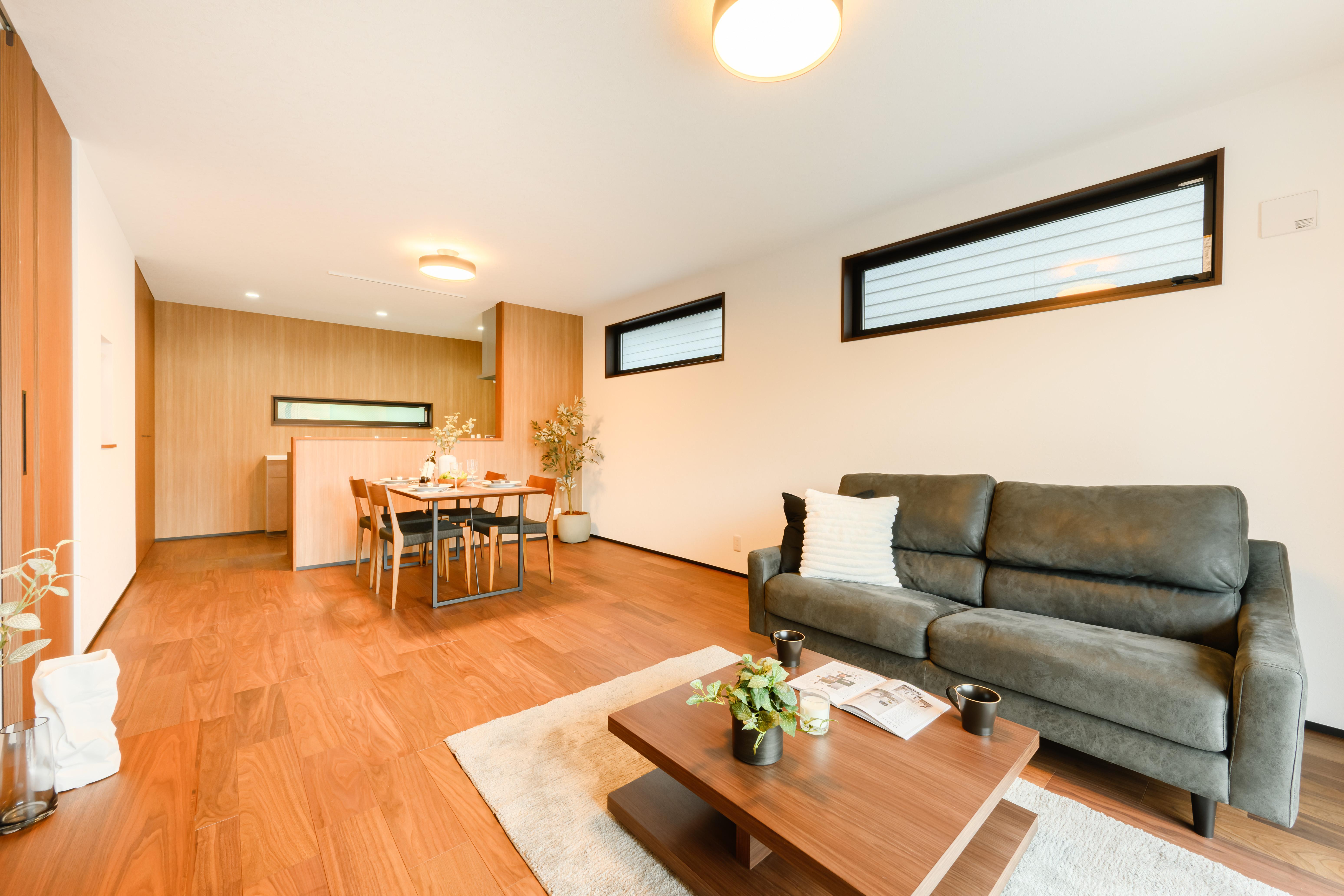 低めのソファとローテーブルを組み合わせ、視線が抜けるように設計。外装や建具のトーンに合わせ、ウォールナット×グレーで統一し、ダークグレーの外観にも自然に馴染みます。