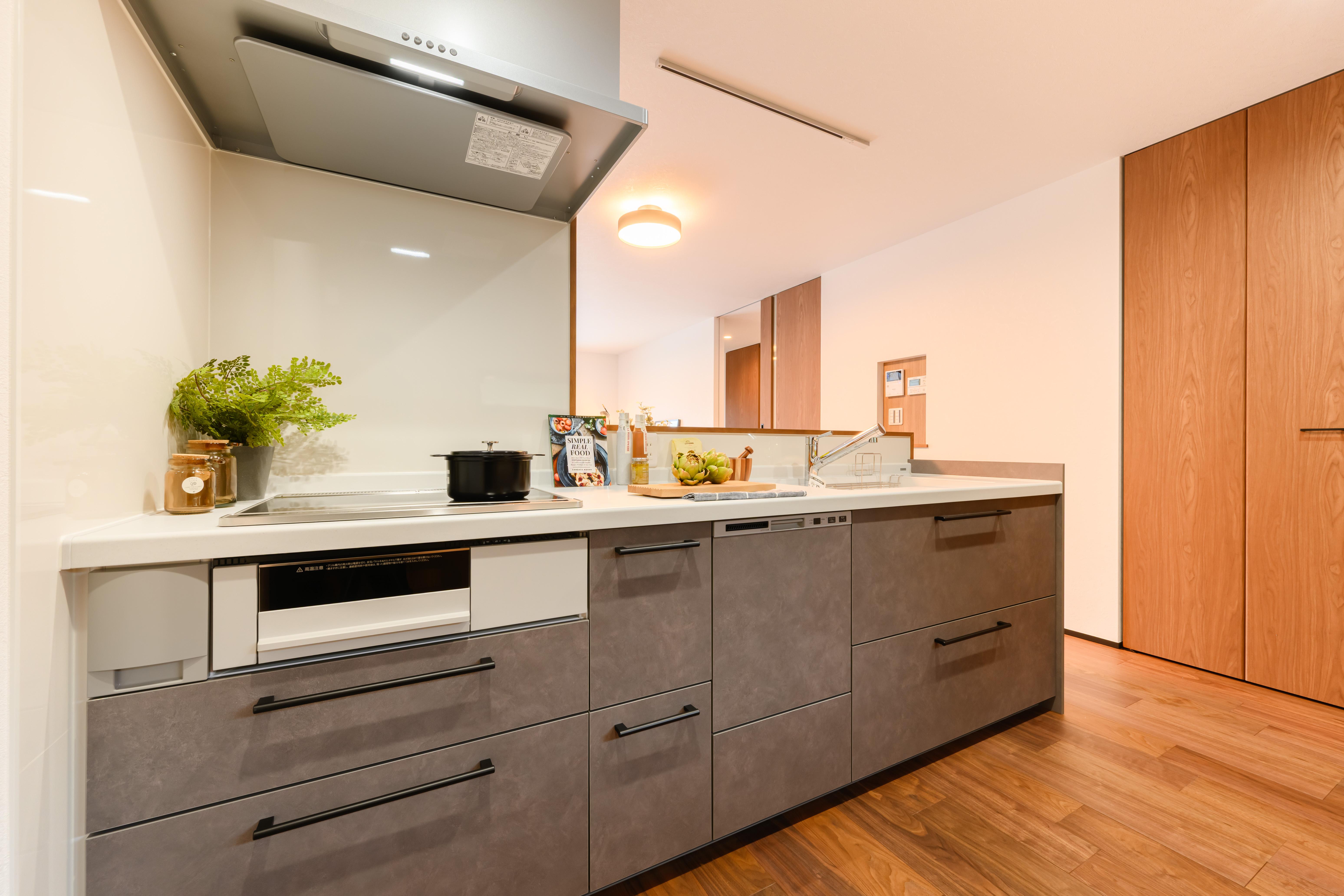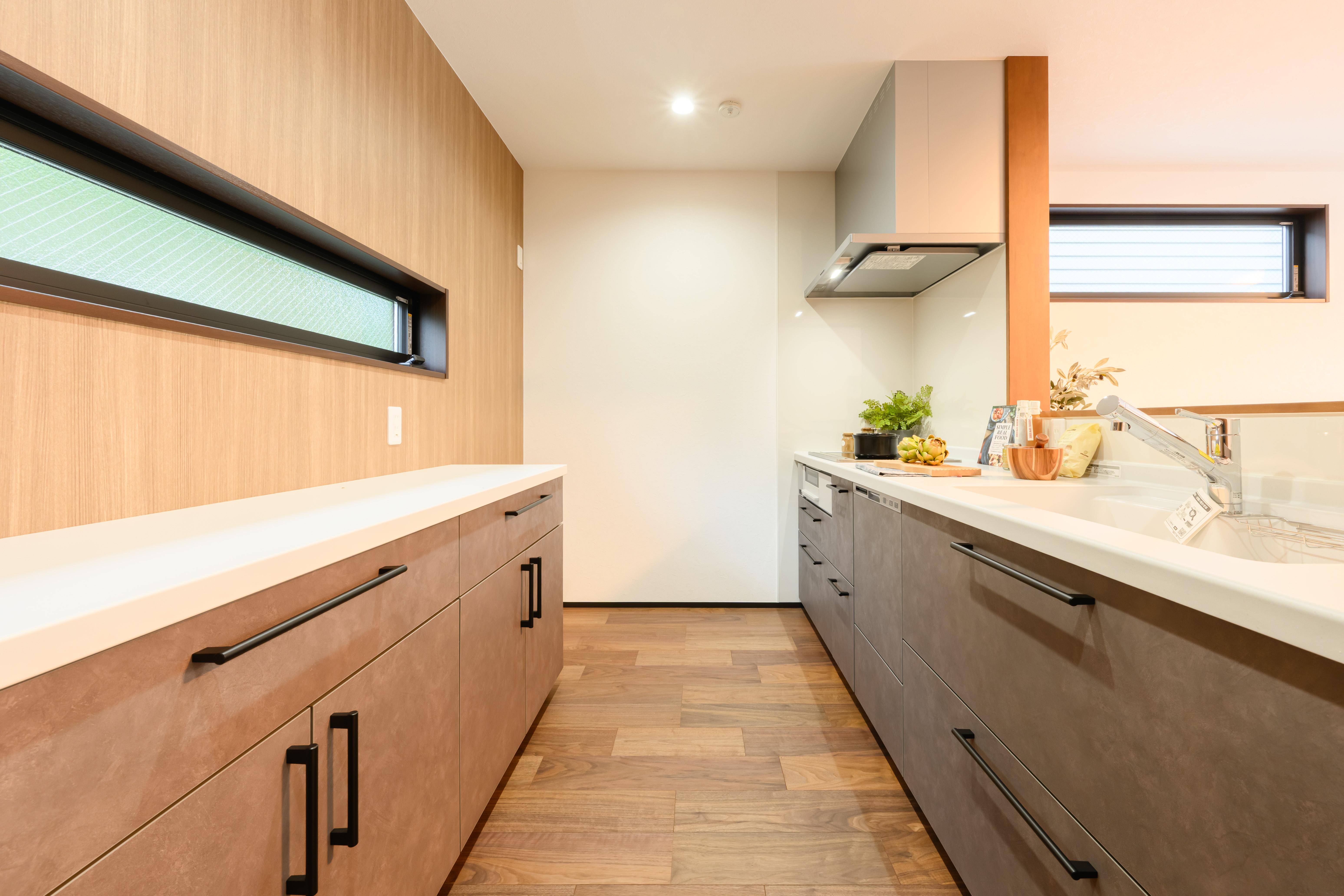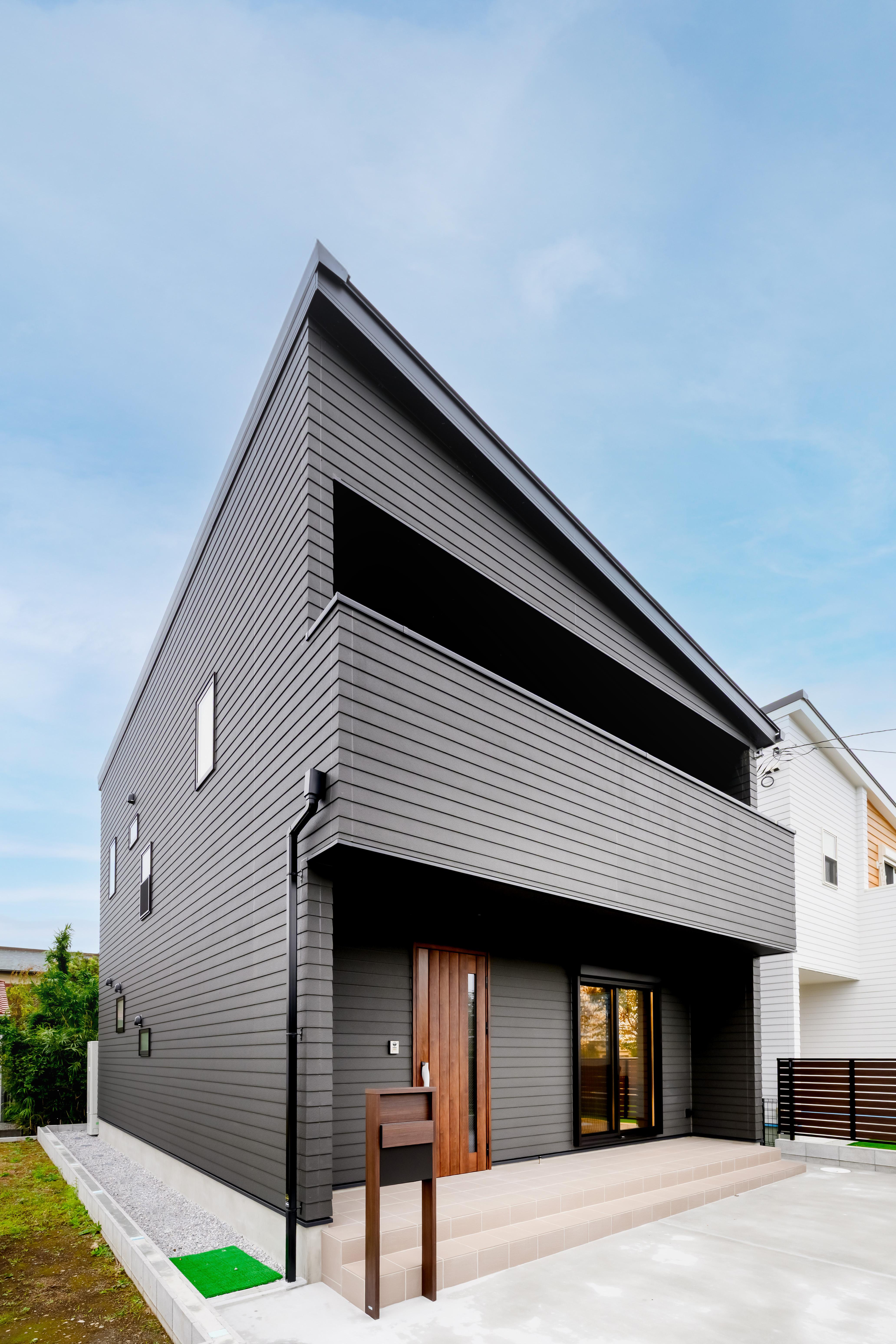 ダークグレーの外観とウォールナット調の内装に合わせ、