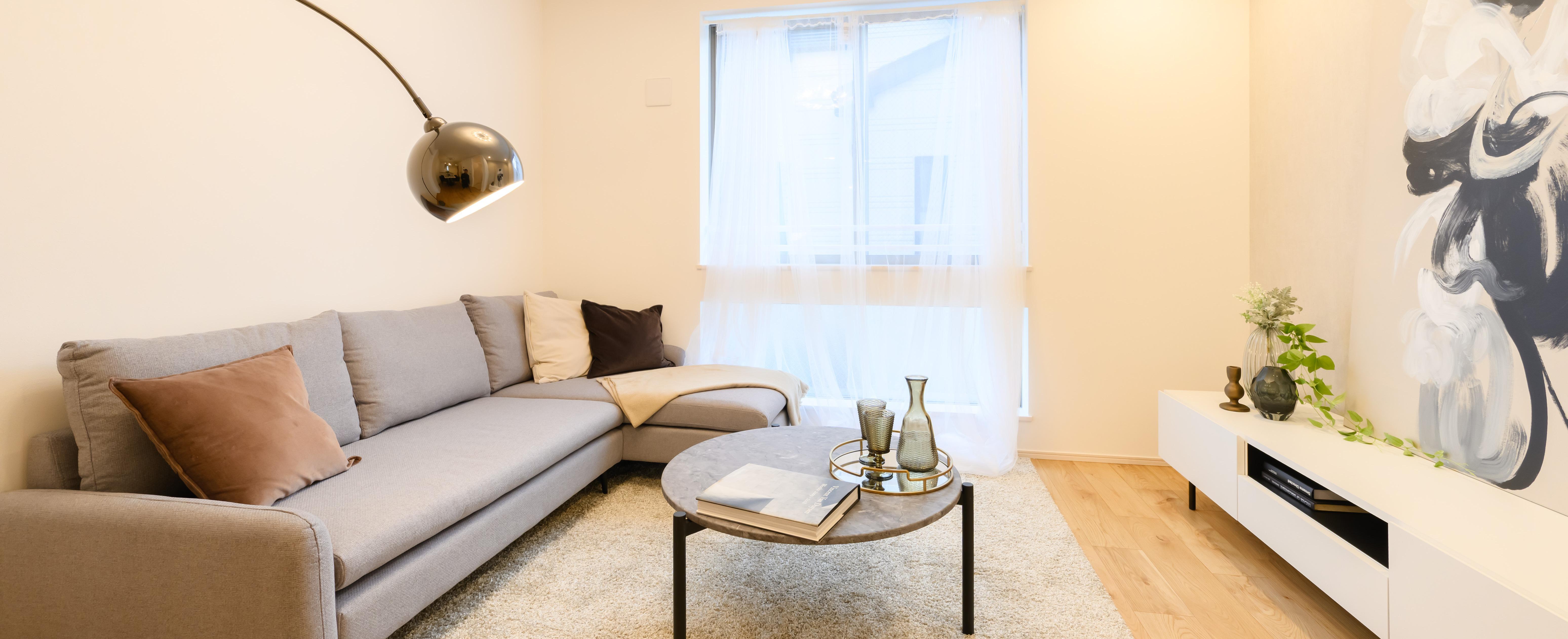 コーディネートのコンセプトは、“都会で洗練された暮らしを叶える、上質で華やかなモダン空間”。目黒区・都立大学という立地、天然木フローリングの内装に合わせ、全体をライトベージュやホワイト、グレートーンでまとめつつ、程よく色のアクセントや素材感を追加しました。