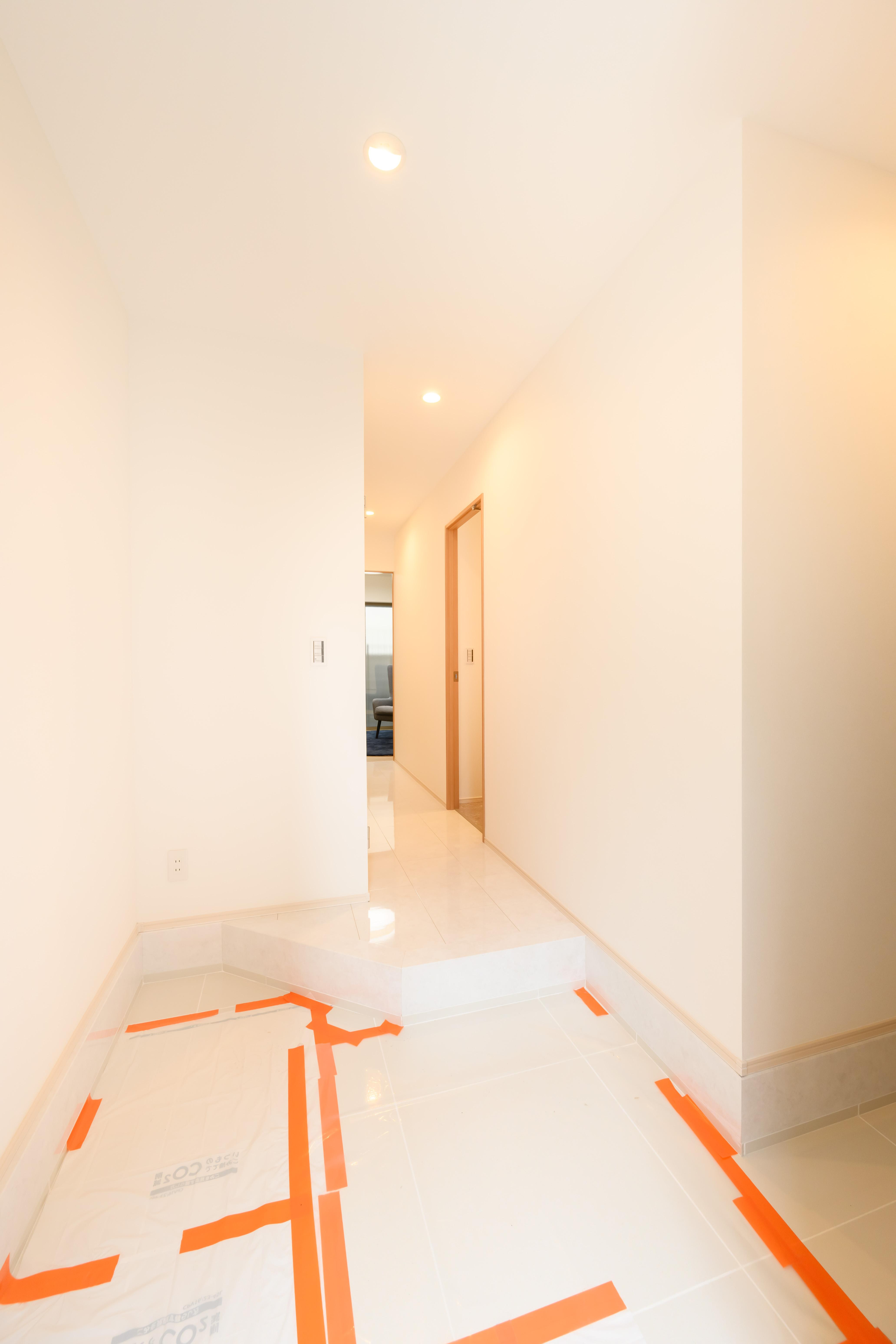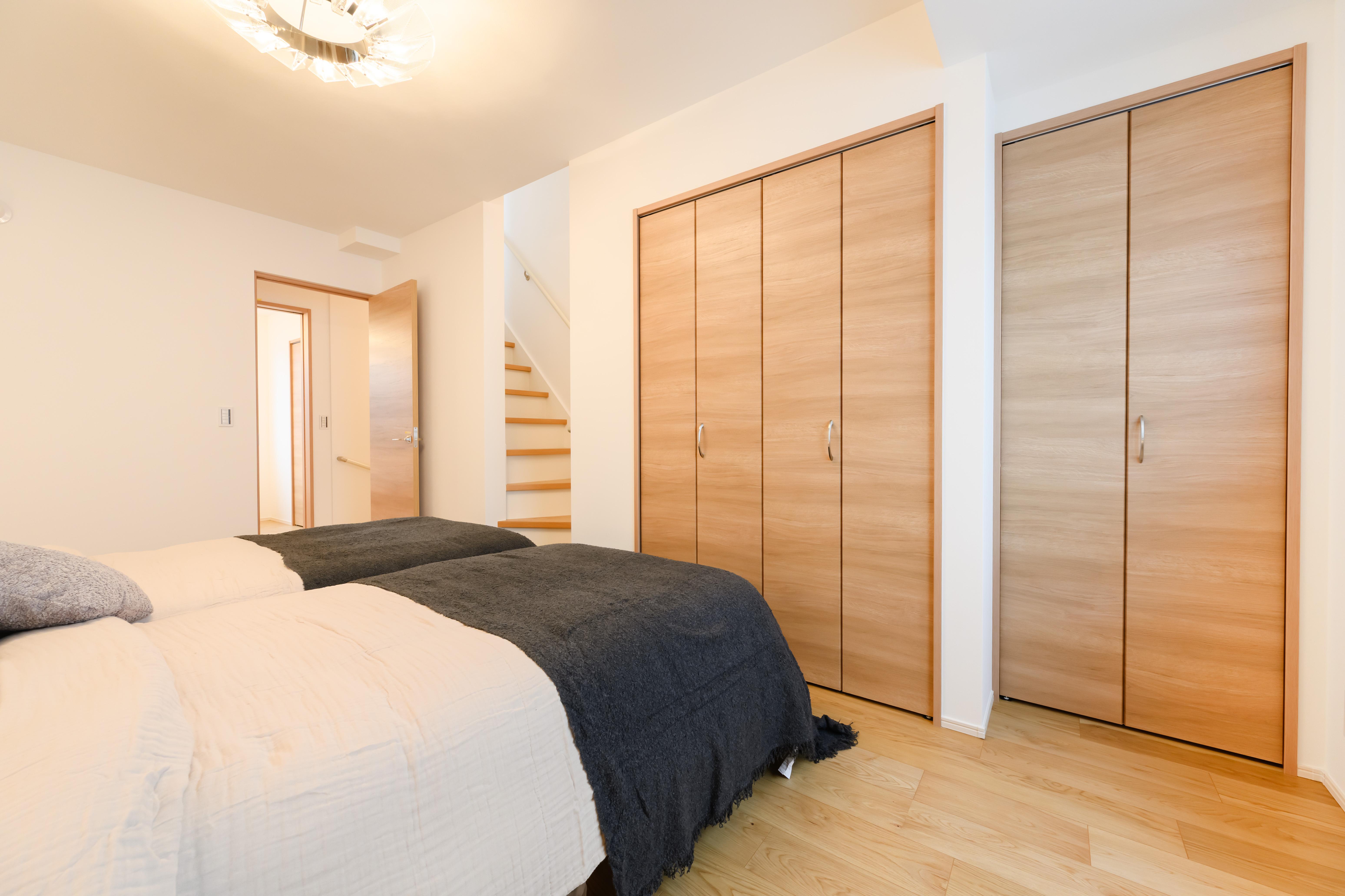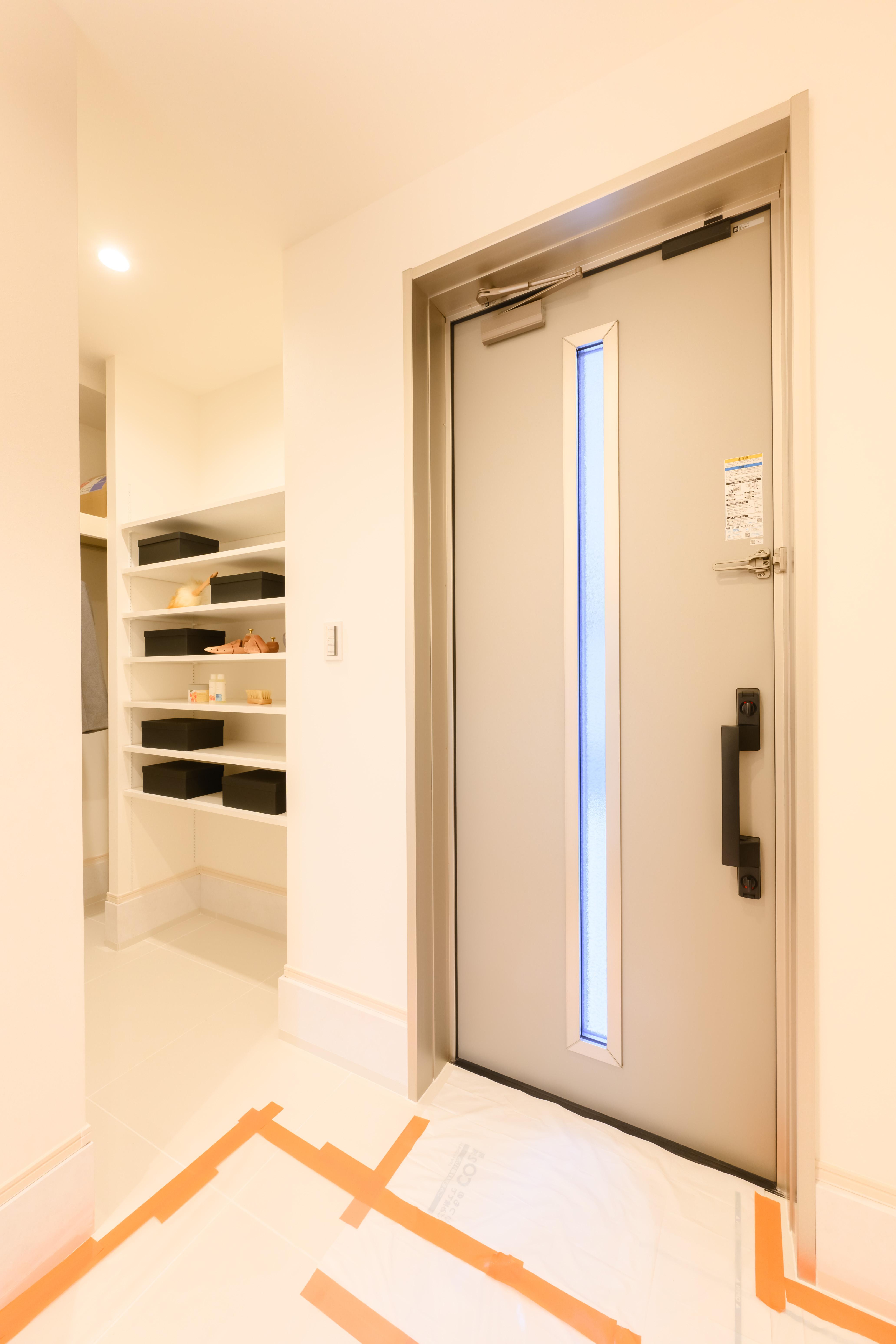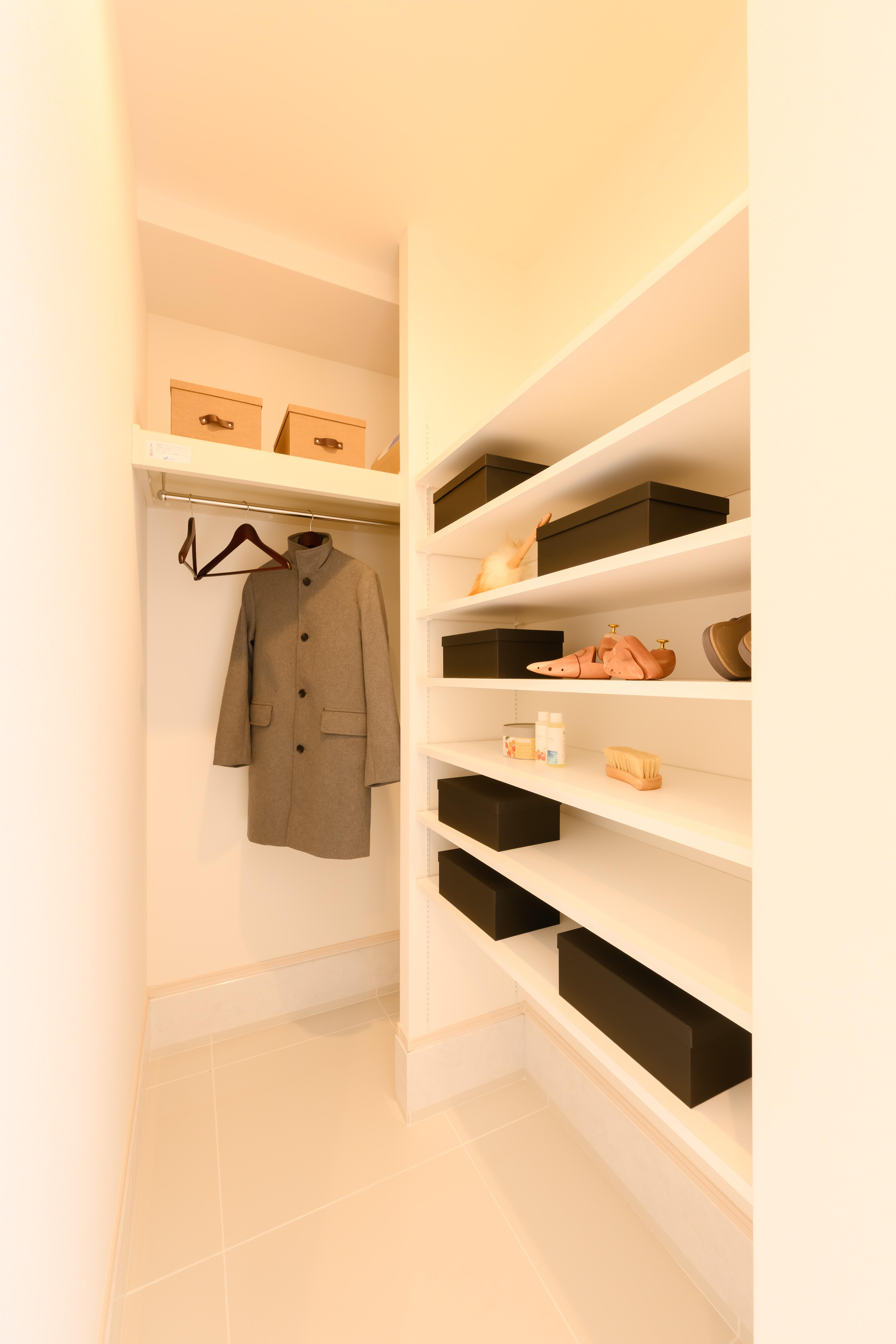 第一印象を決める玄関からの動線に合わせて、シューズインクローゼットと収納棚を配置。ハンギングバーを設け、外出時のコートを掛けられる設計に。花粉やほこりを居室に持ち込まず、クリーンな空気を保てます。靴や小物もシンプルに収納され、来客があってもすっきりと魅せられる嬉しい間取りです。
