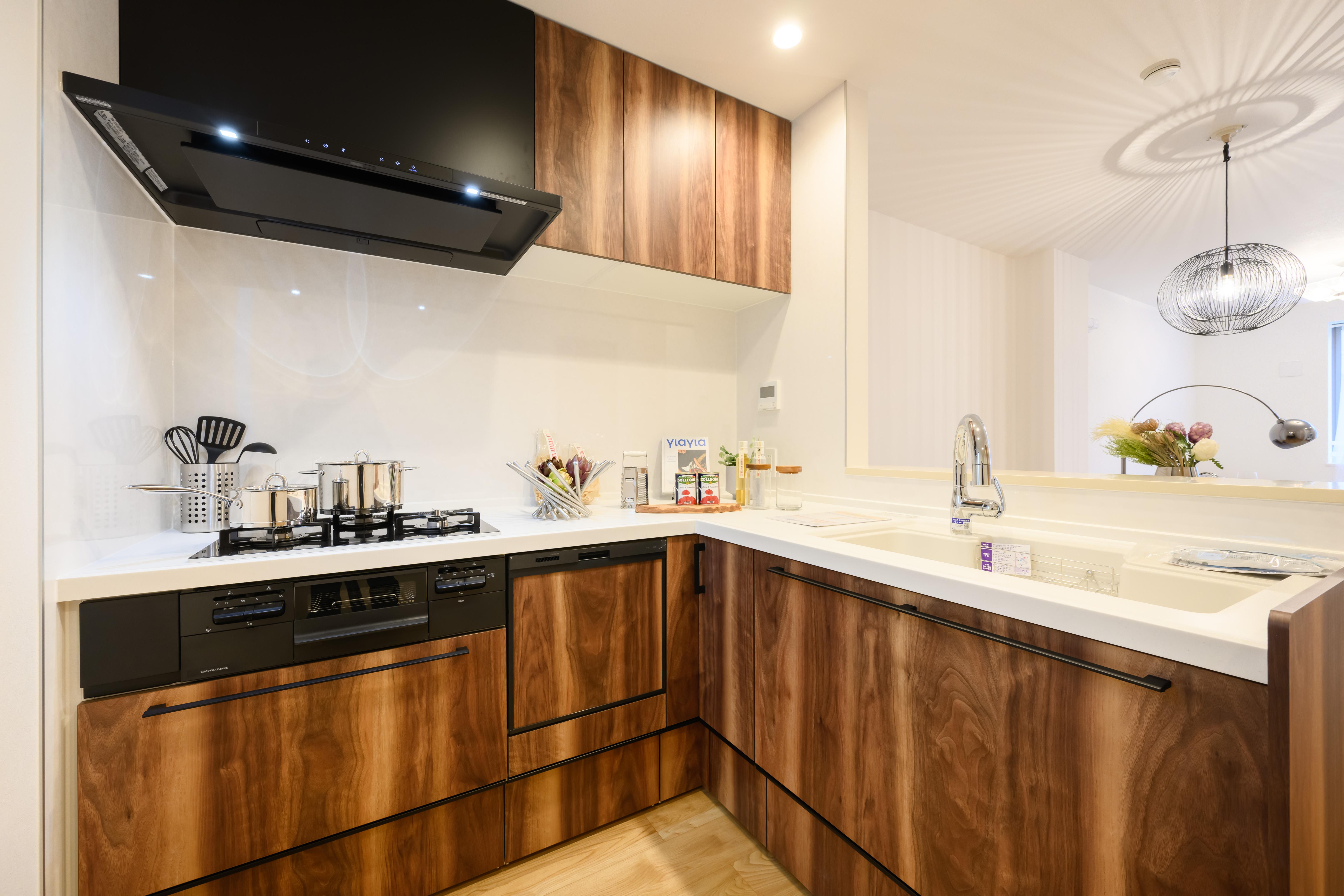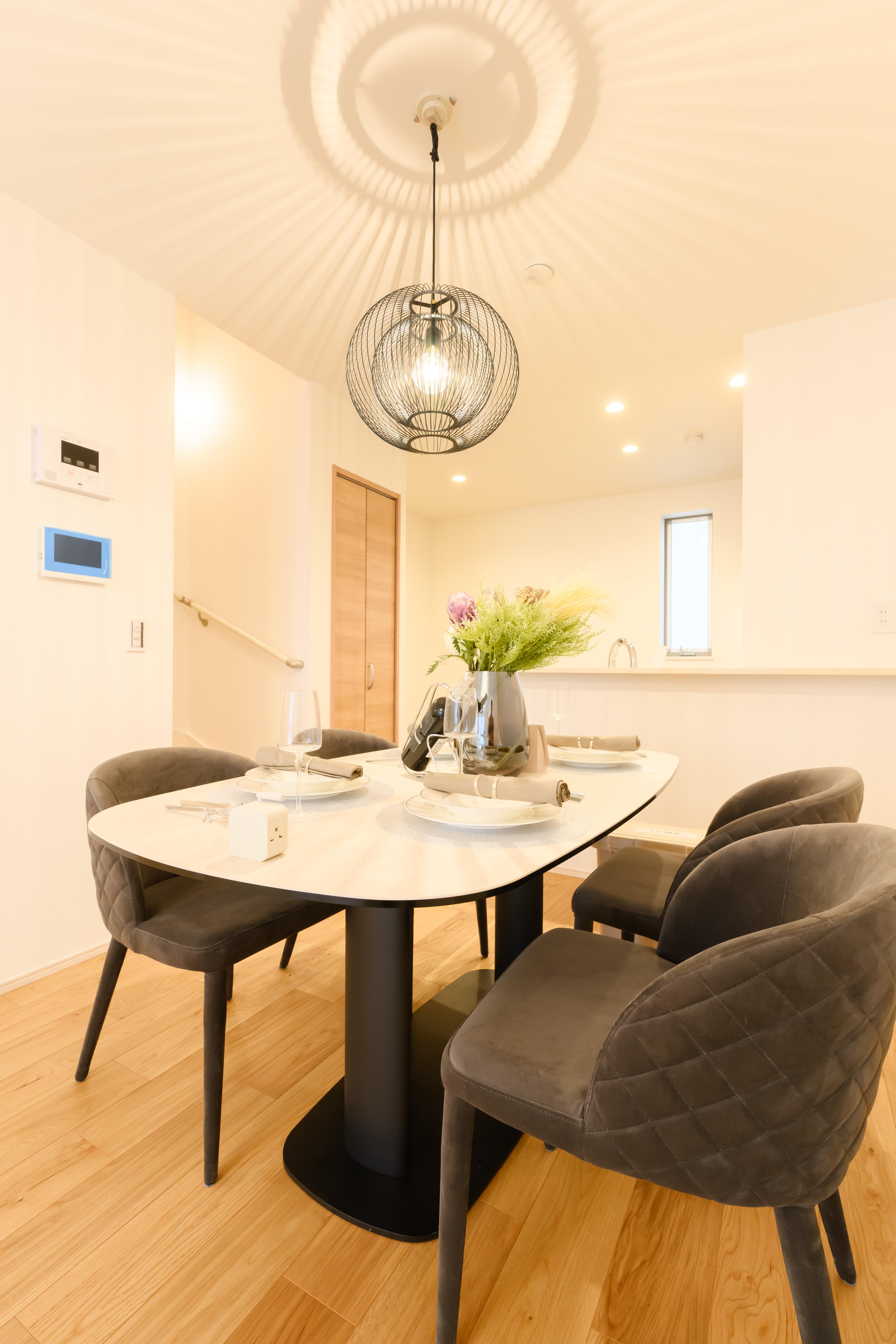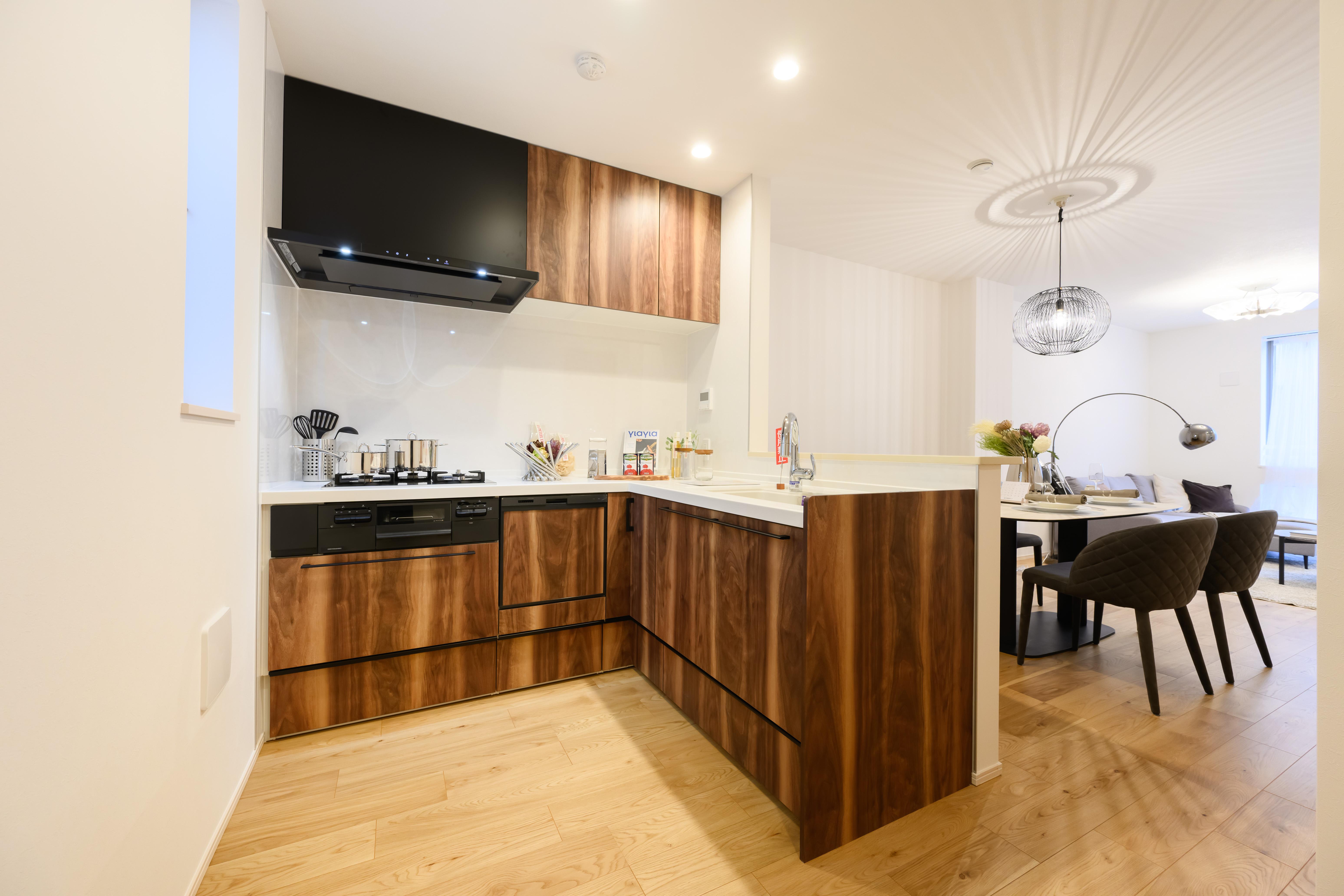 ダイニングテーブルは160cm幅のゆったりサイズ。照明には存在感のあるペンダントライトを選び、テーブル面に程よい明るさを演出。花瓶を置いても映える空間なので、毎日お花を飾りたくなりそうです。キッチンはウォールナットの木目が美しいこだわりの空間。カウンターが広々としているので趣味の料理もこれまでよりも捗ります。