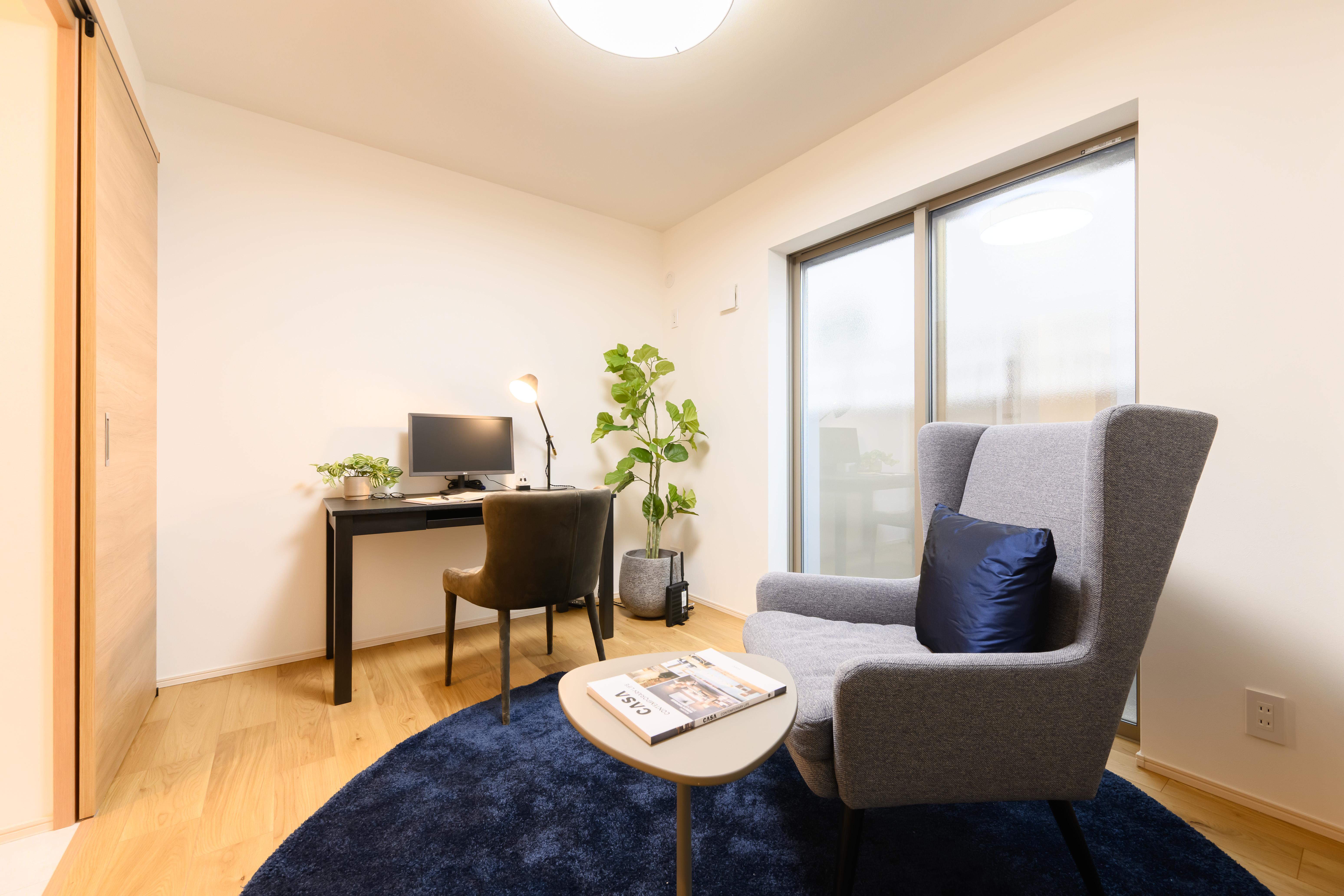 1階のサービスルームはワークライフバランスを大切にする大人のためのワークスペースとして設えました。デスクは奥行きゆったりの60cmで、手元が広く使えるように選定。ブラウンのデスクにダークグレーのチェアを合わせることで、モダンで締まりのある大人の空間に仕上げました。仕事の合間に息抜きできるよう、一人掛けのソファーや質感の良いラグも配置。作業だけでなく、インスピレーションが湧く書斎をイメージしてコーディネートしています。