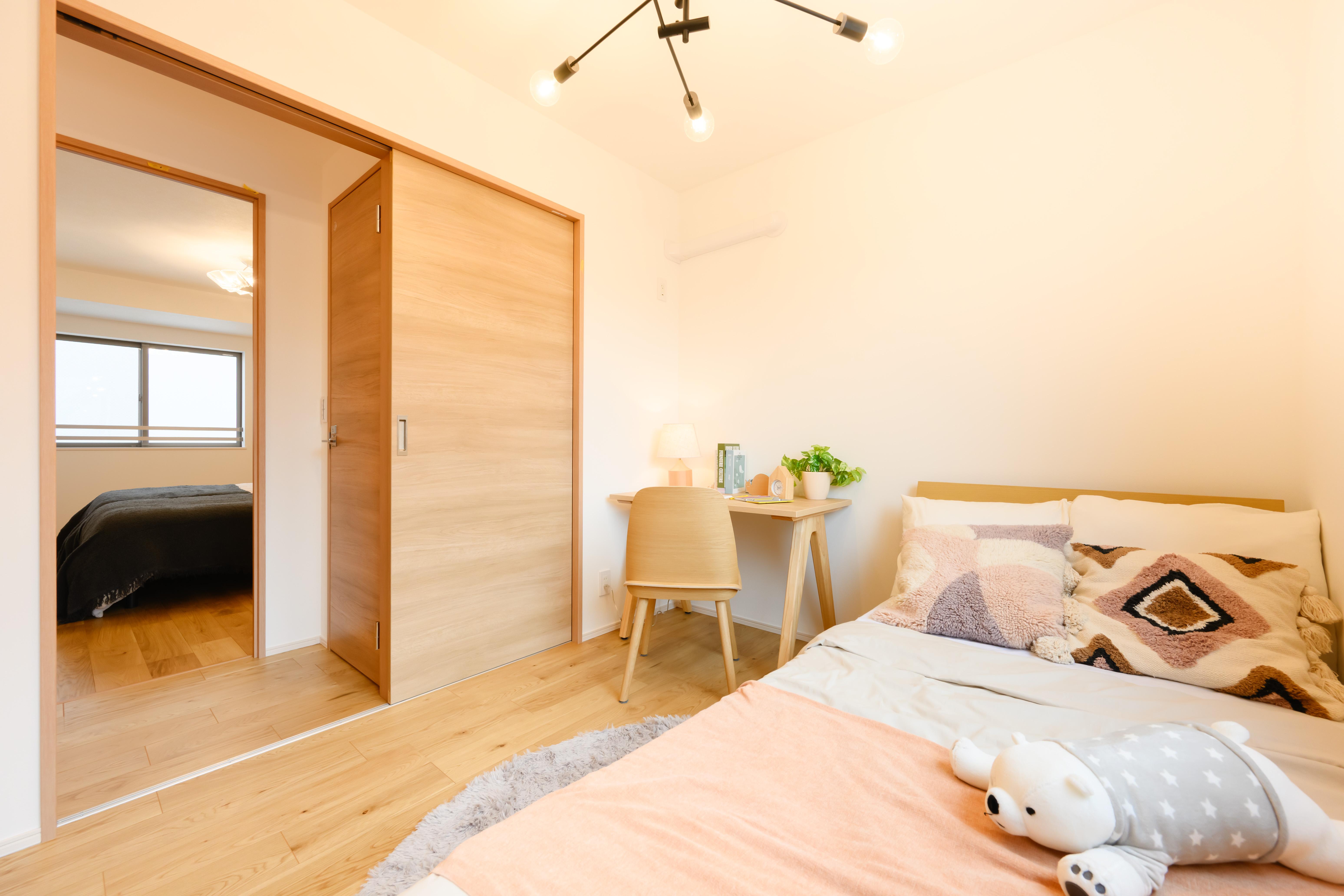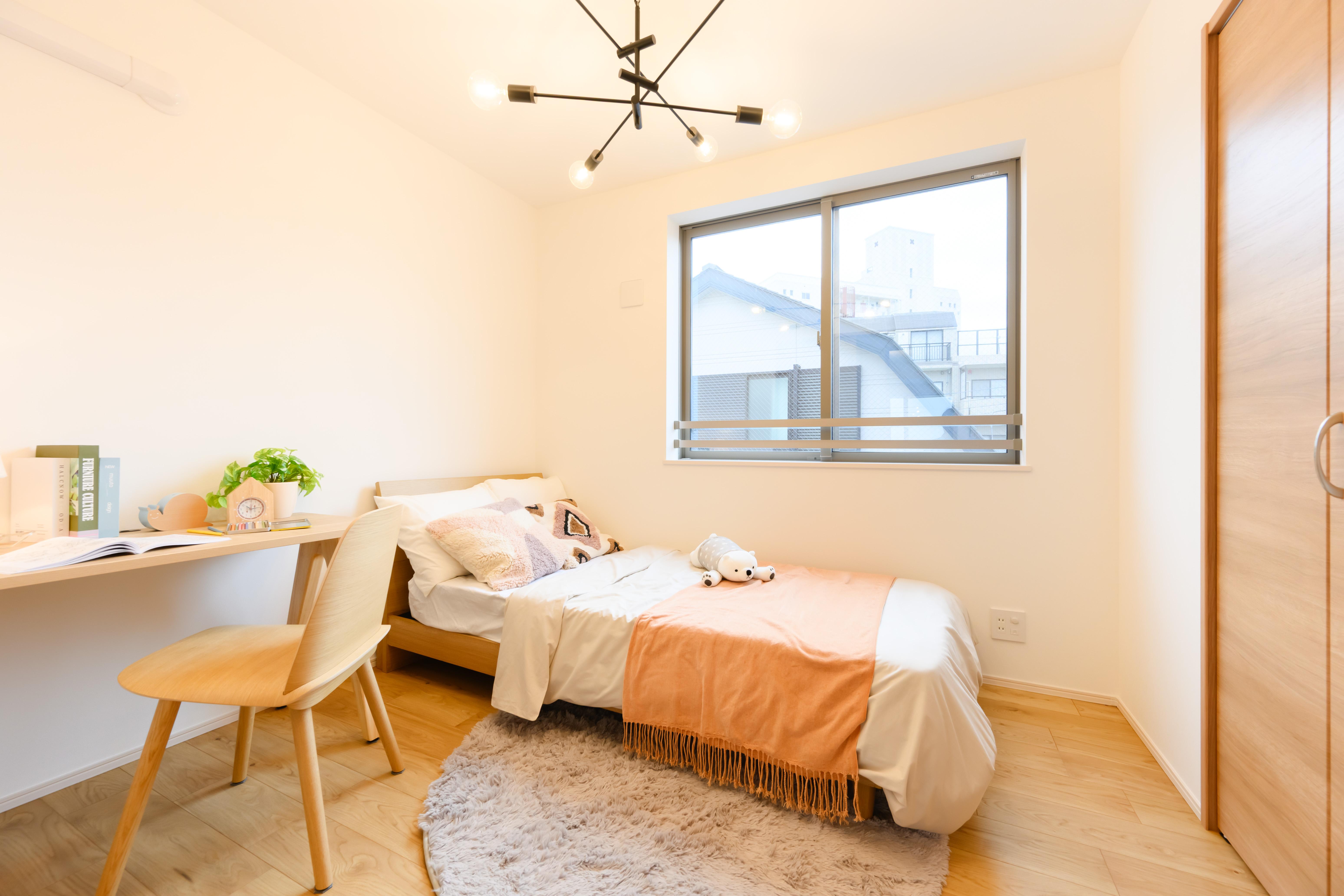 子ども部屋は、可愛さに偏りすぎず知育にも配慮したインテリアに。机は幅100cmと、お子様が成長しても長く使えるサイズ感を選びました。ベッド周りにはやさしいライトを複数使い、心地よい眠りを誘導。丸いラグや小物で遊び心をプラスし、のびのび育てる都心のキッズルームを表現しています。