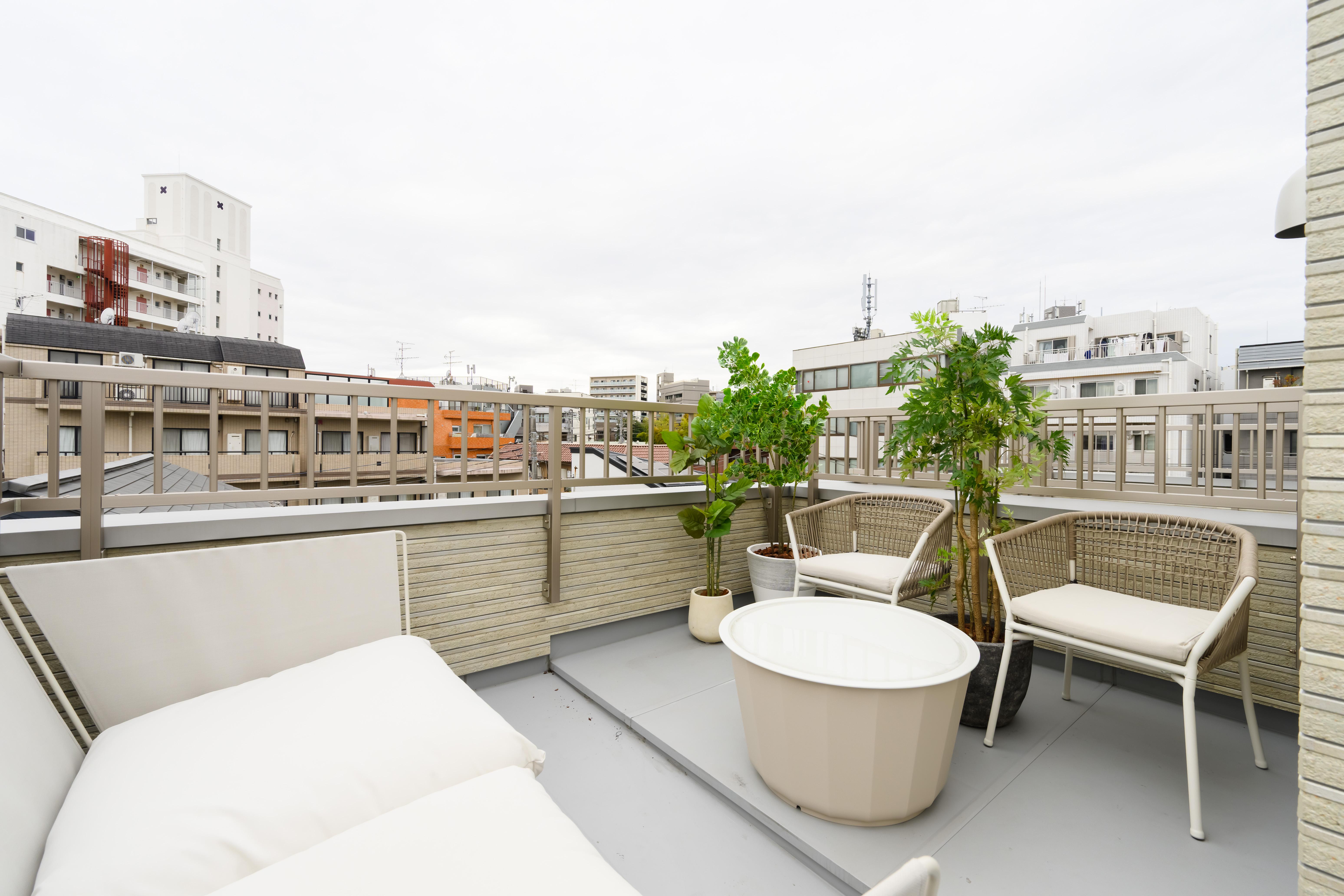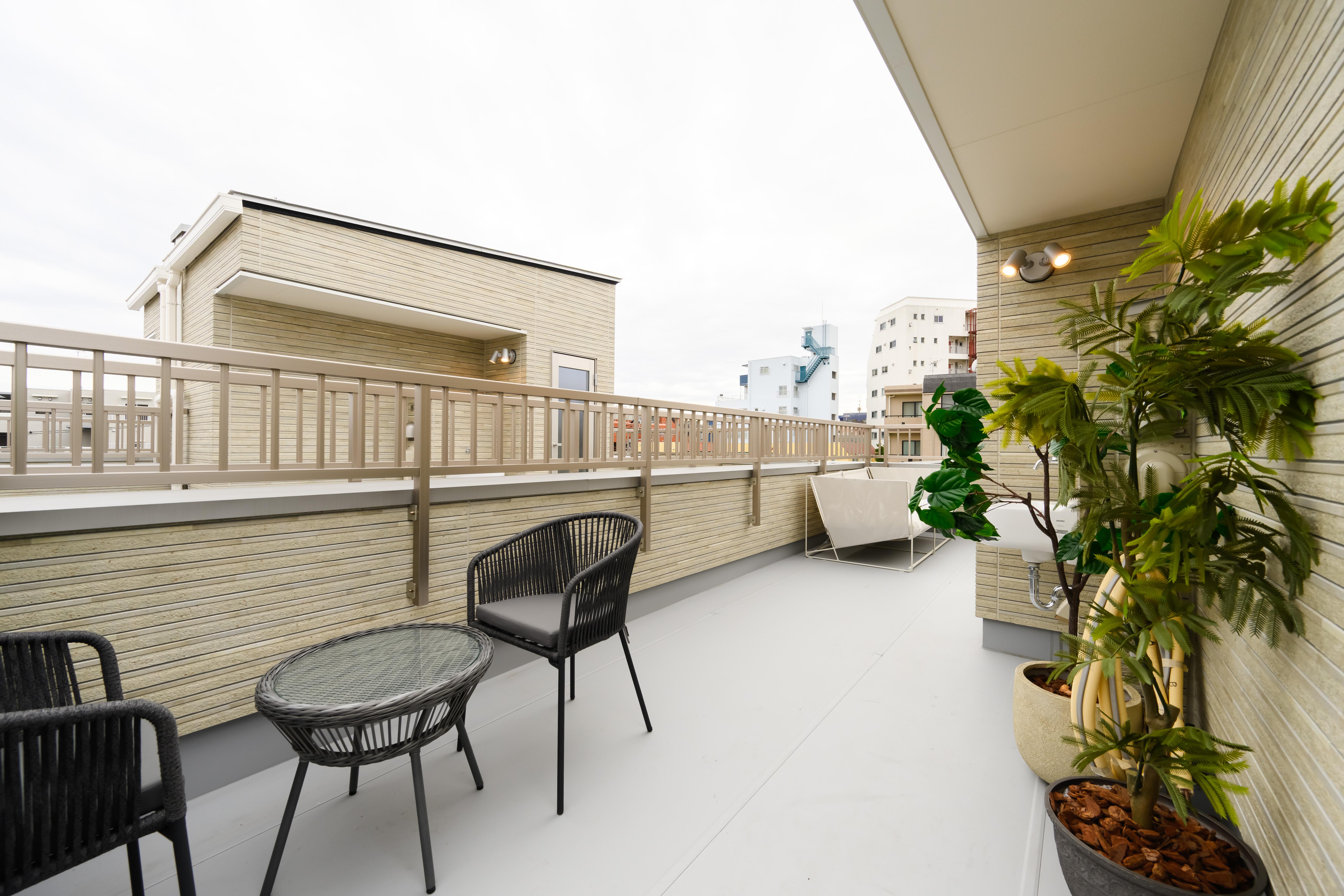 24.04m²のルーフバルコニーを、都会でのプライベートガーデンとして演出。ラウンジソファやサイドテーブルなど、屋外仕様の家具は質感とメンテナンス性のバランスを重視。フェイクグリーンを含め複数のグリーンを配し、四季を身近に感じられるリラックス空間に。