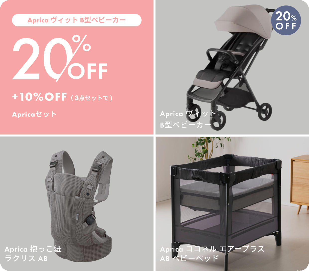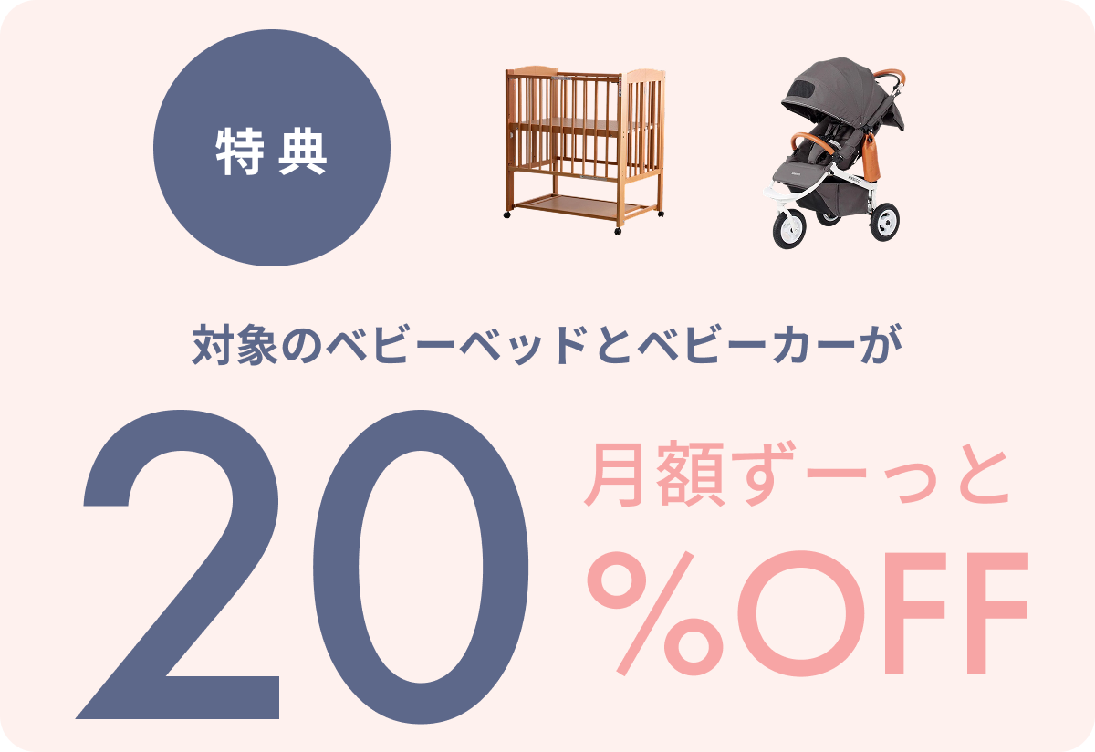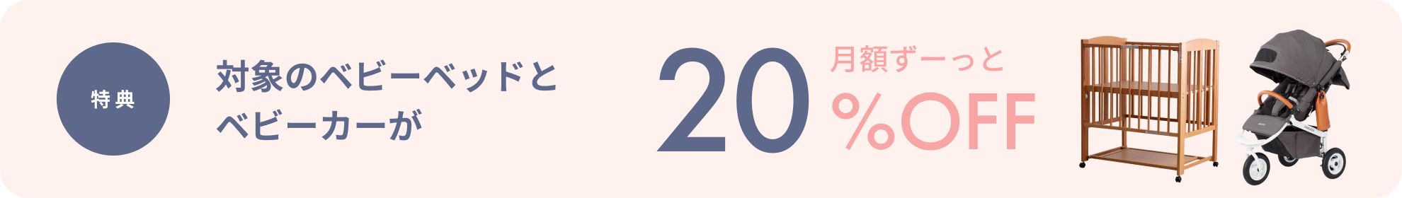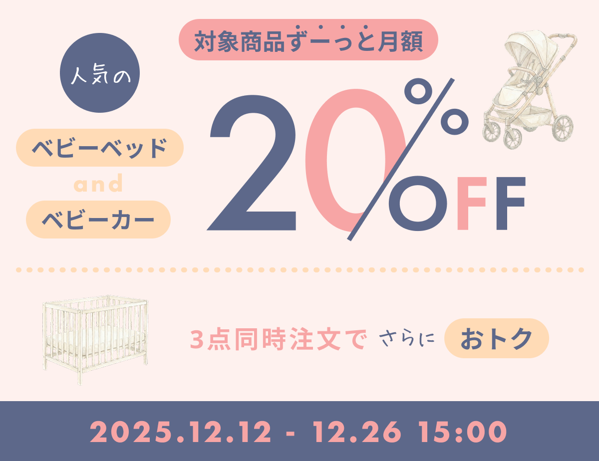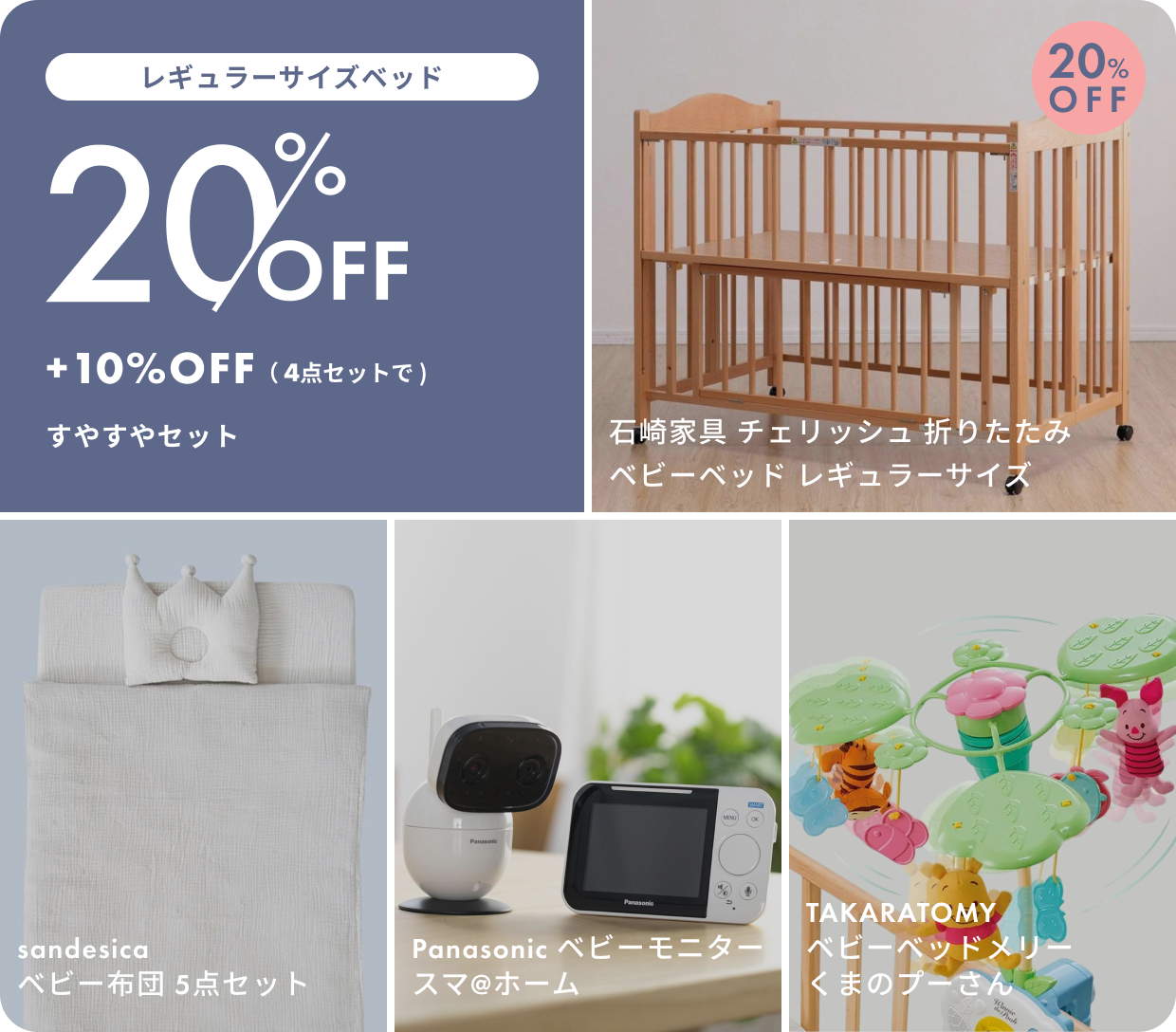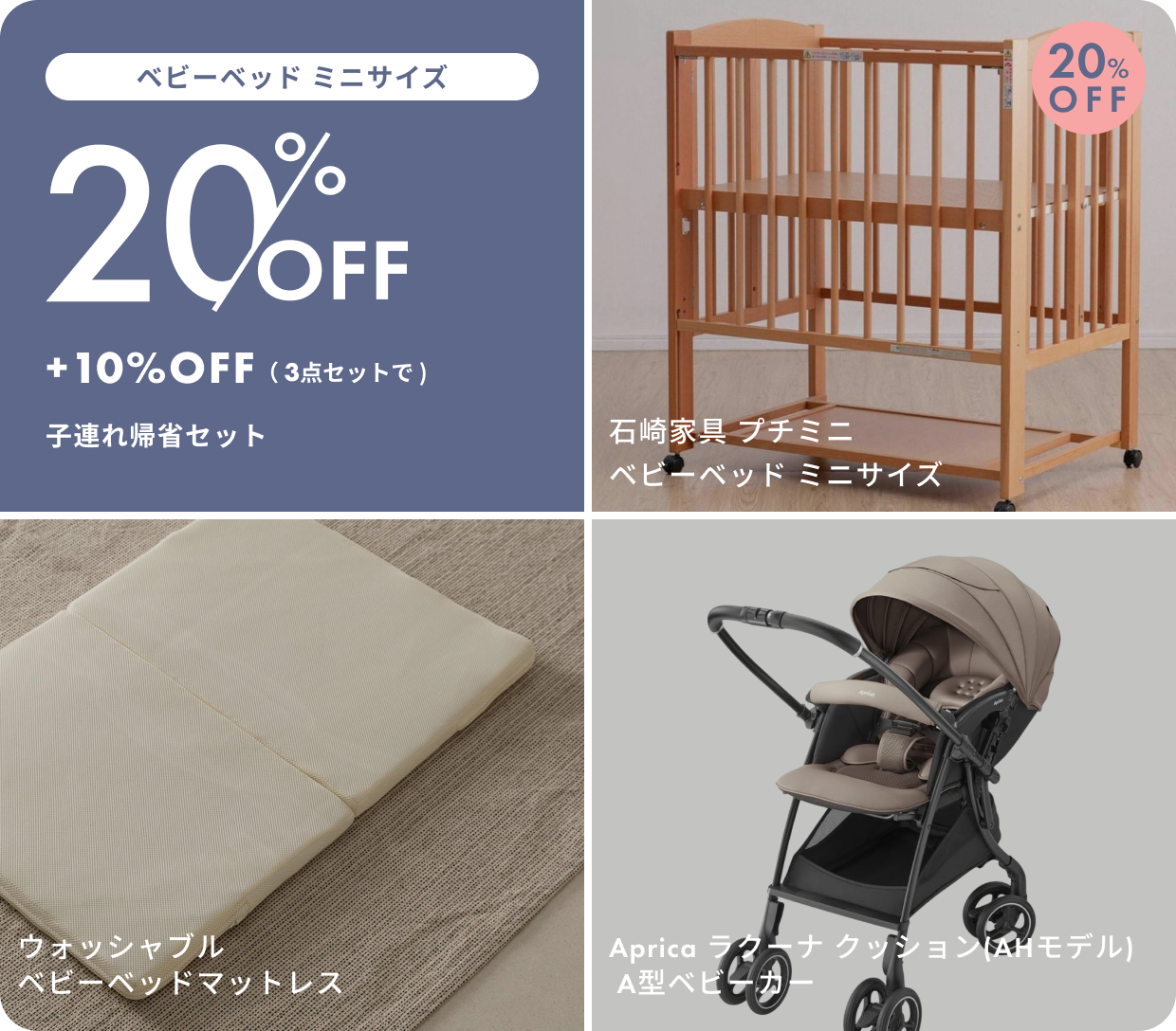 ①:期間内に新規で対象のベビーベッド・ベビーカーをご注文で20%OFF