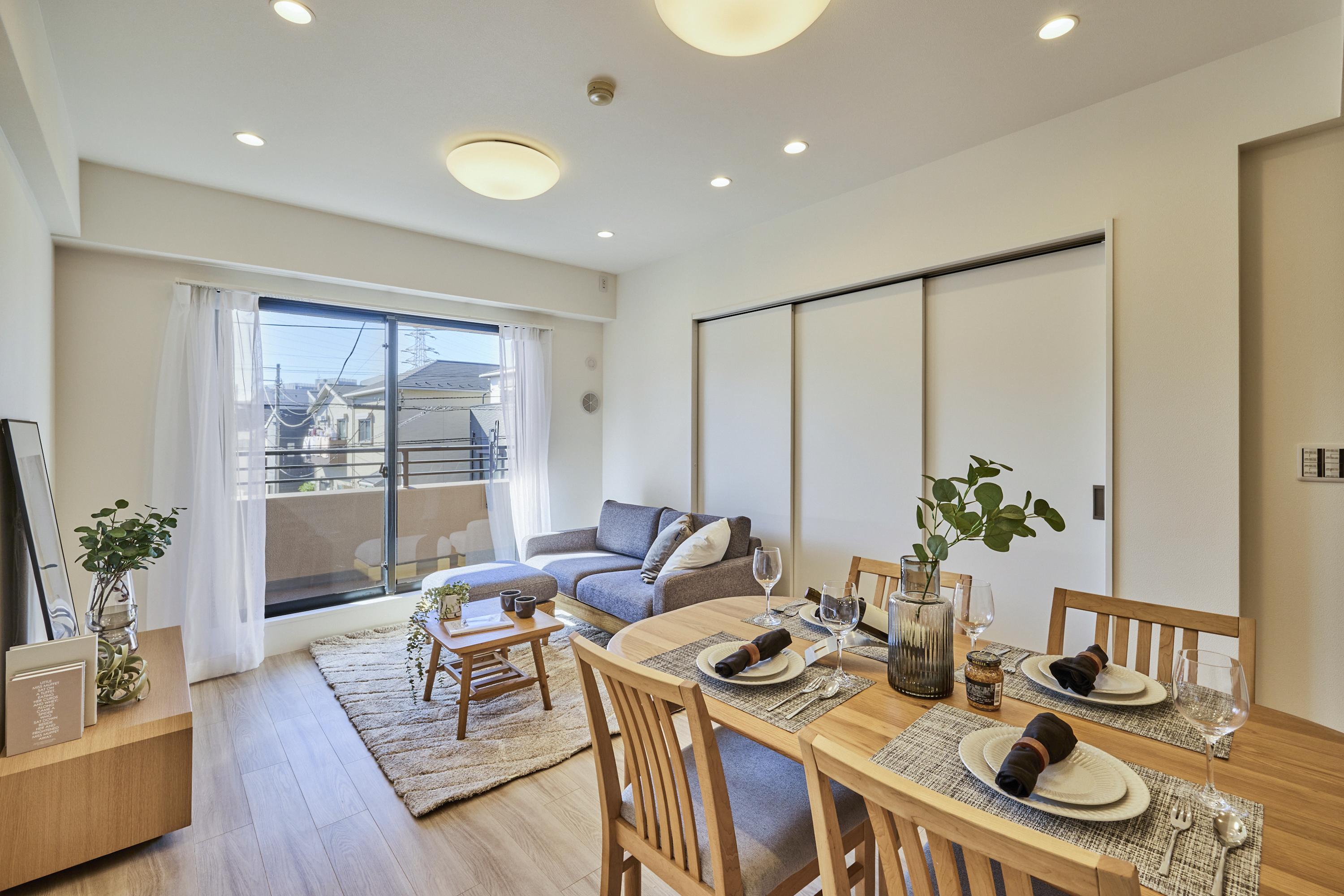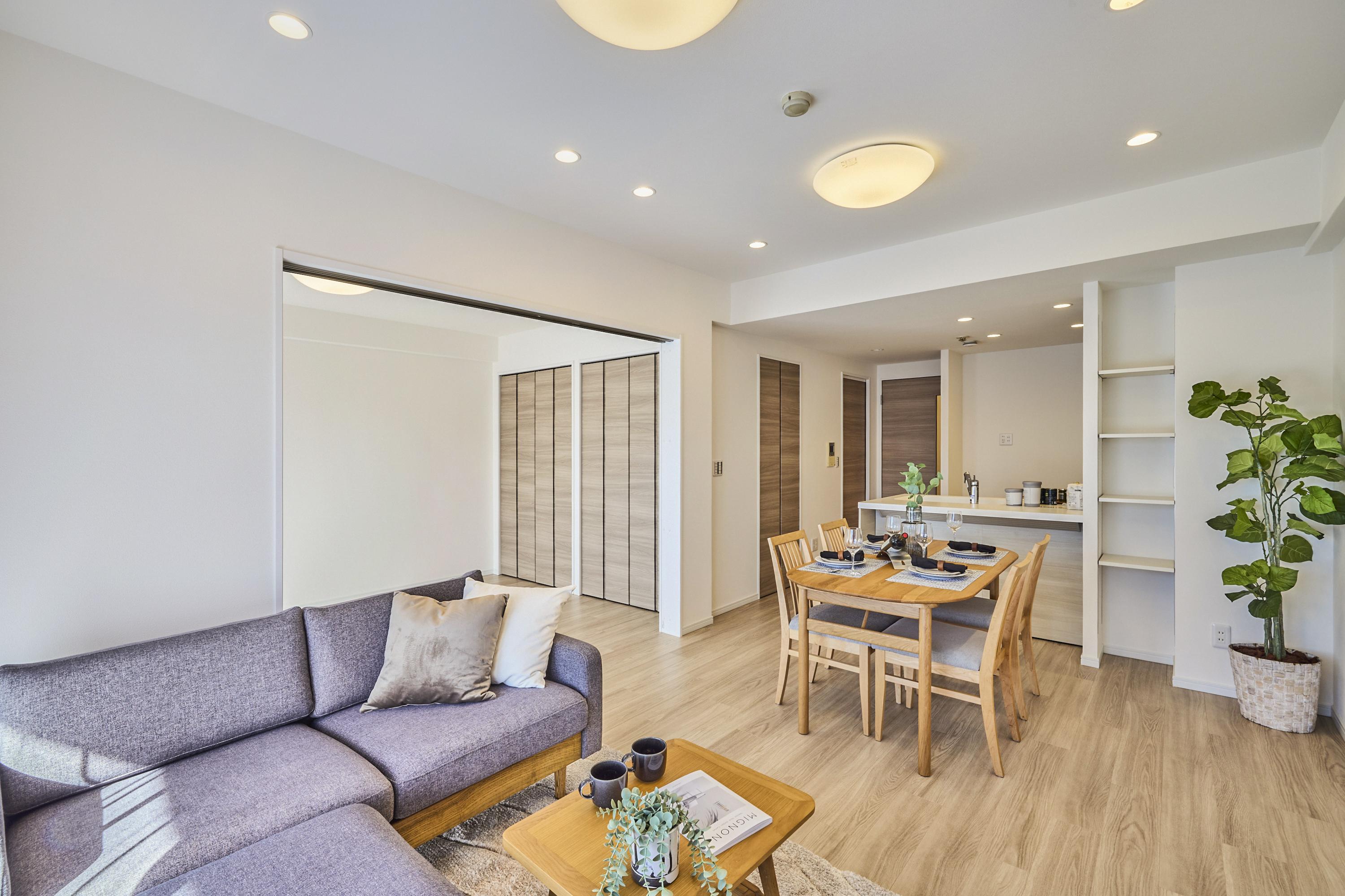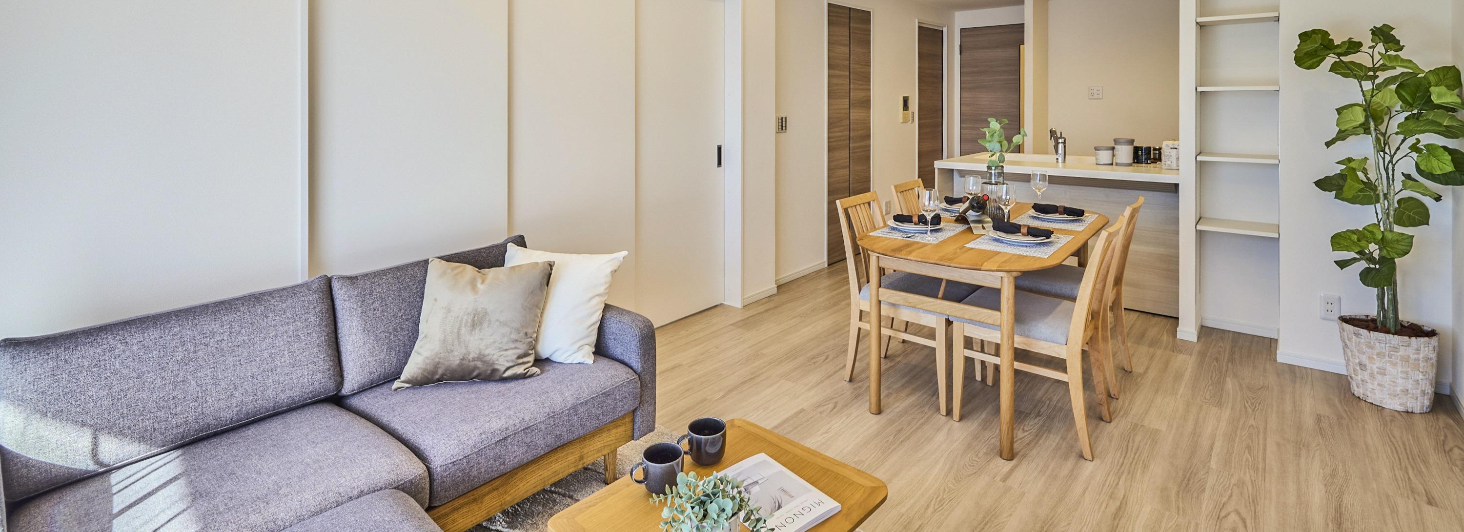 LDK15.3帖の広さを最大限に活かすため、ソファとローテーブルはあえて低めのデザインを選びました。視線が自然と奥まで抜け、実際の帖数以上にゆったりと感じられます。ファブリックは光沢感のあるナチュラルカラーで統一し、やさしい雰囲気を大切にしています。このエリアらしい落ち着いた空気感とも相性がよく、バスアクセスの立地だからこそ「家で過ごす時間が心地いい」ことを重視しました。