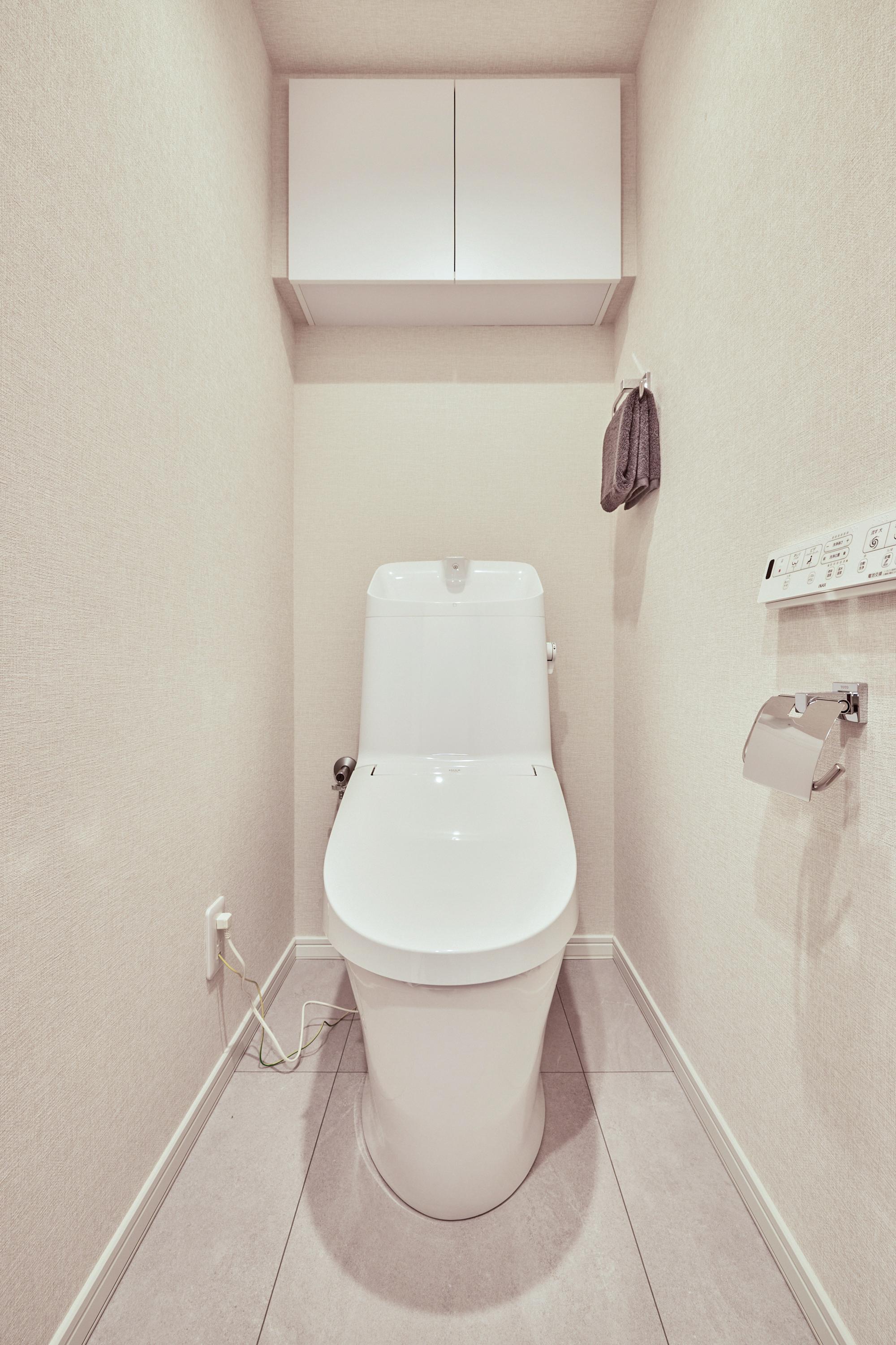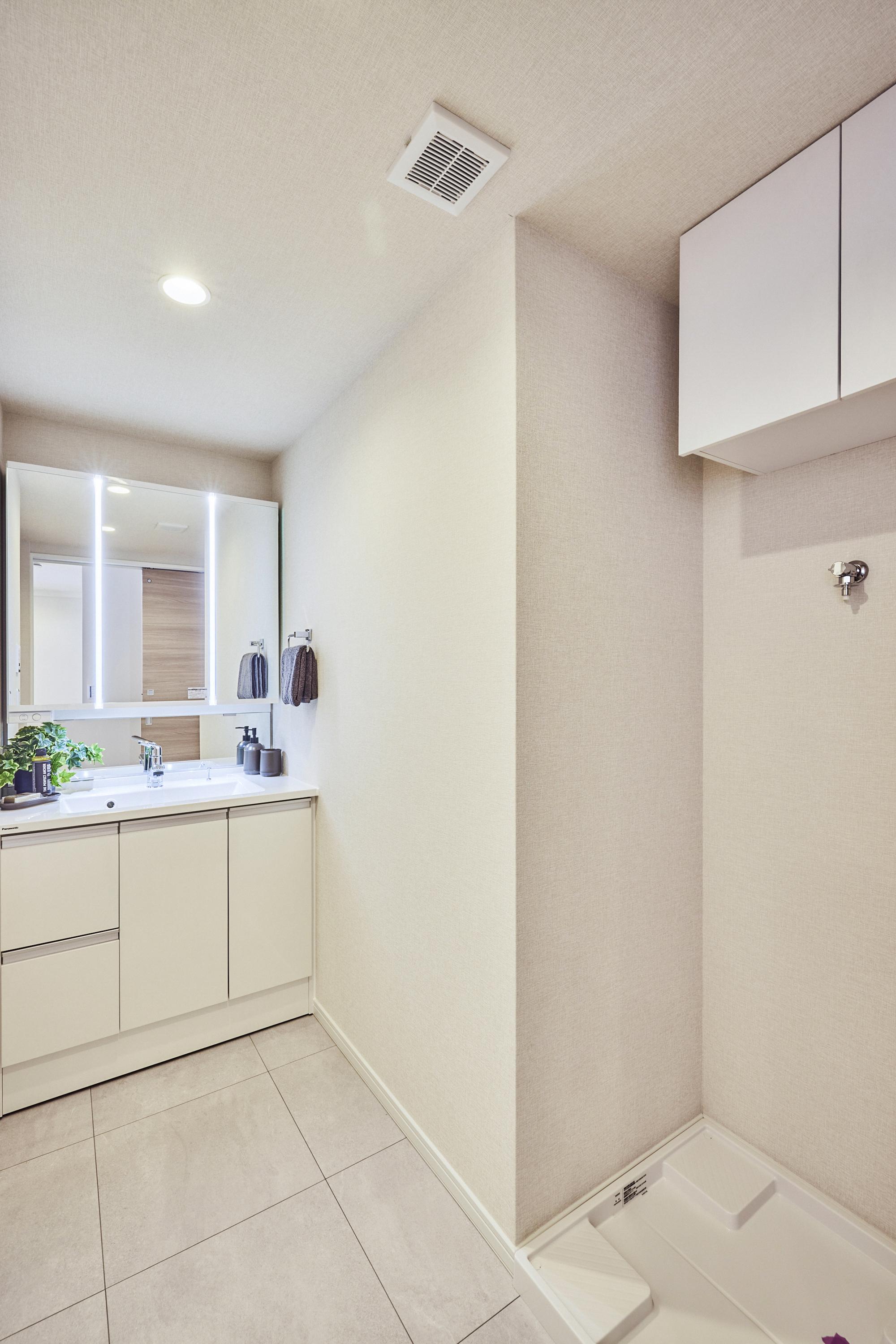 水回りは主張しすぎず、ダイニング・リビングと一体感を持たせるグレーで統一しました。新規リノベーションで設備が新しいため、余計な装飾はせず、清潔感と使いやすさを前面に出しました。