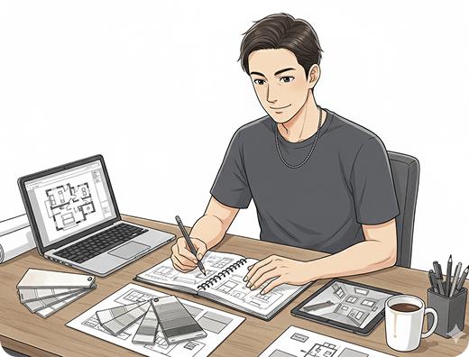 特に大切にしたのは、素材のコントラストです。木(温)×金属(冷)、ファブリック(柔)×ブラック(硬)を混ぜることで、単調ではない奥行きのあるモダン空間になります。