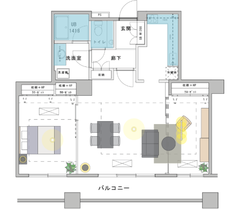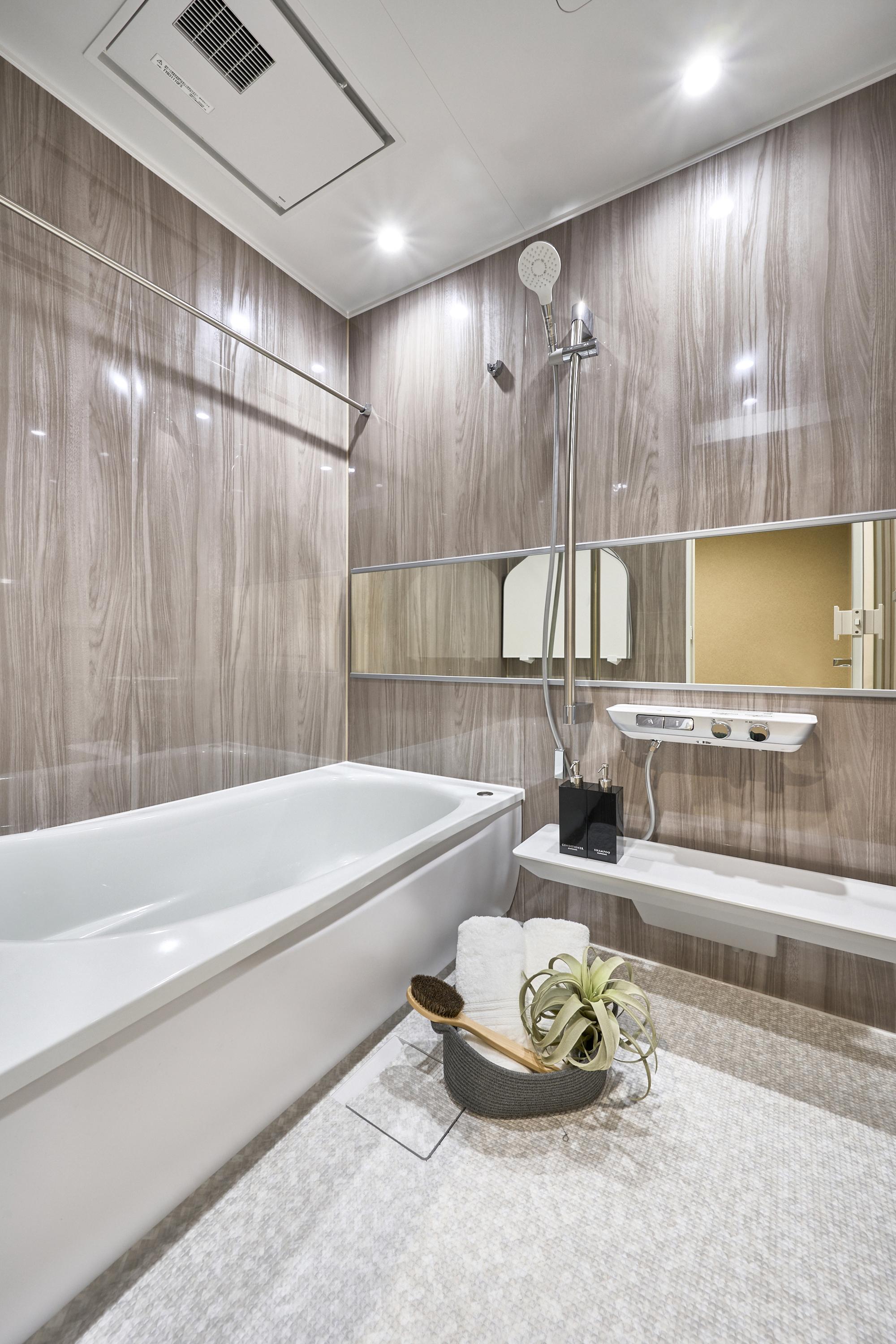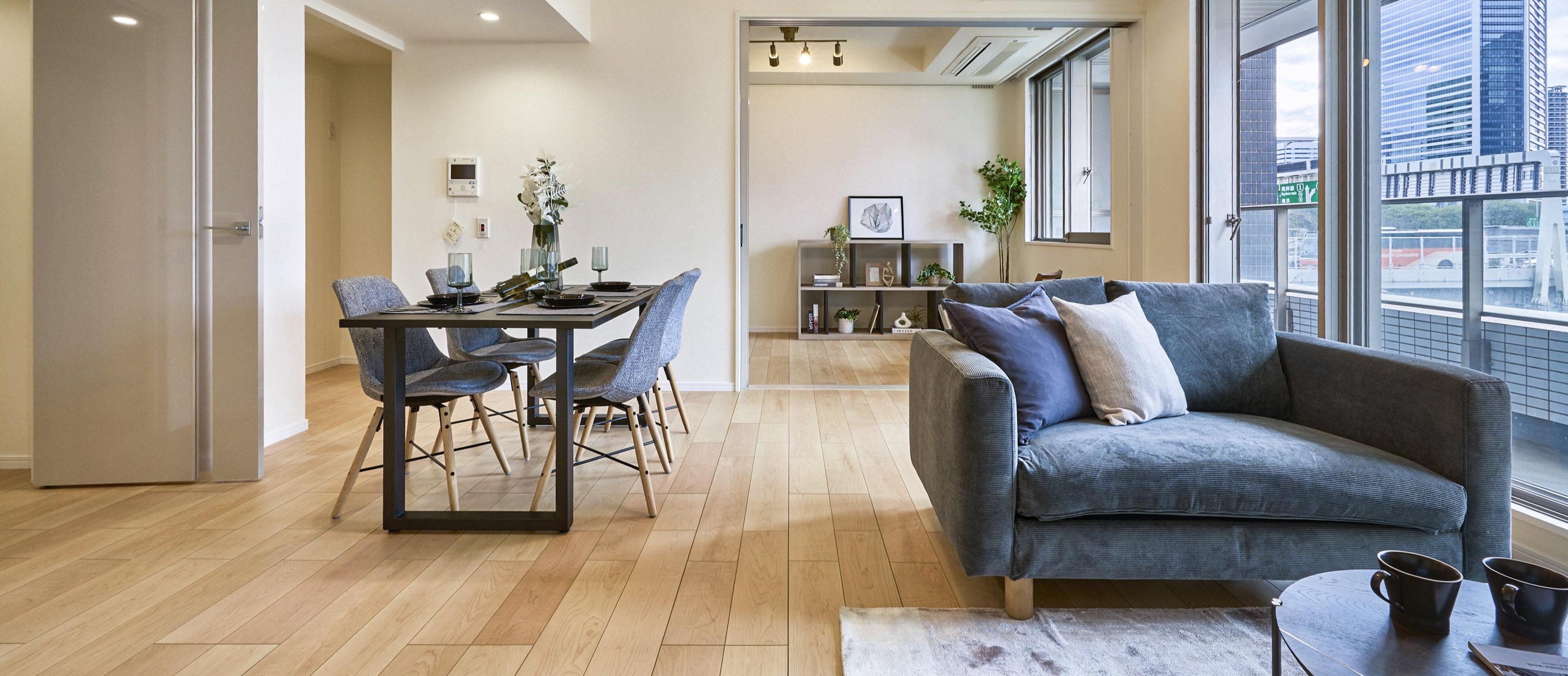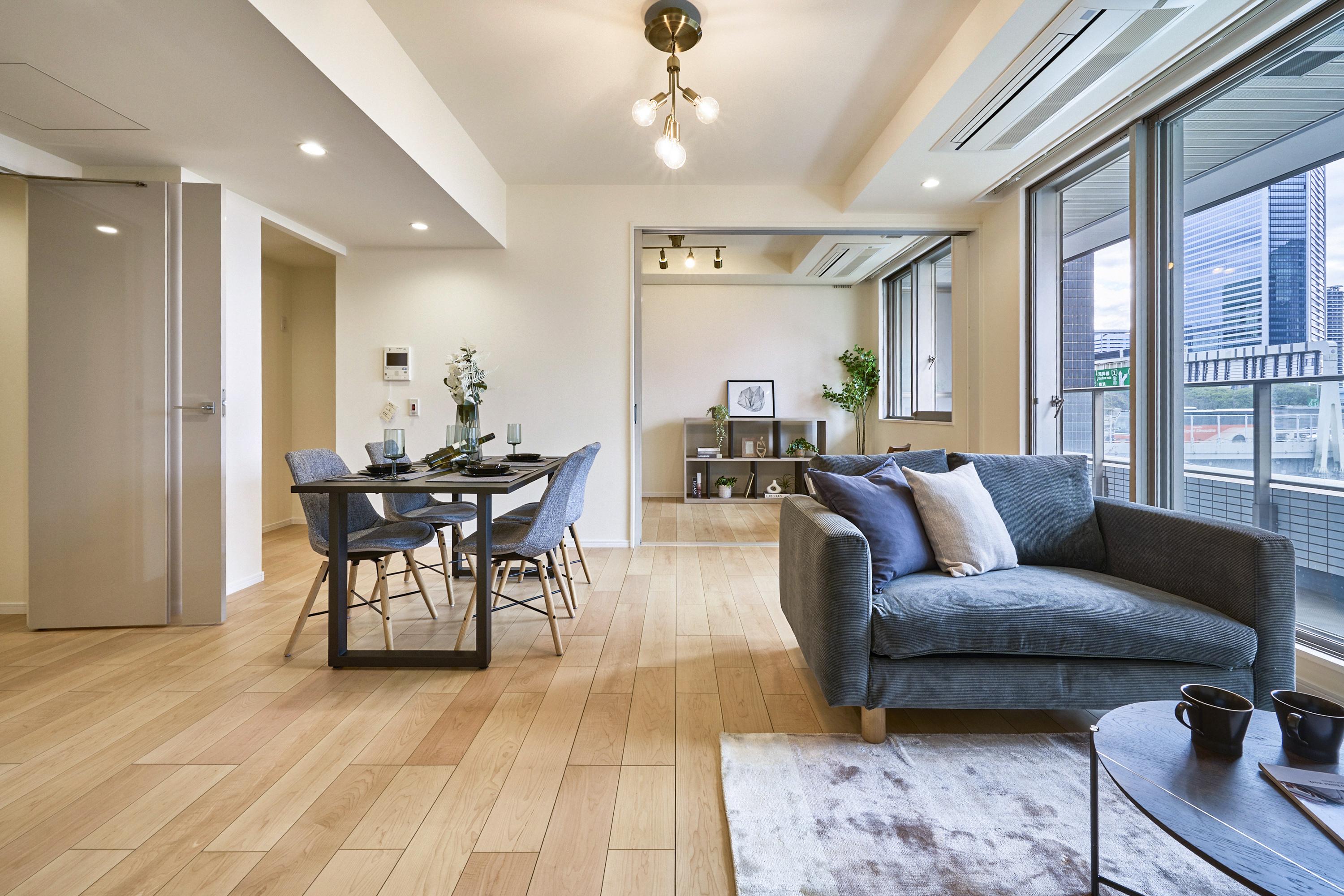 都心の洗練を象徴するブラック・真鍮の硬質な素材に、安らぎを与えるオーク材・ファブリックの温もりを掛け合わせました。 「静」と「動」が共存する、都会のDINKSに相応しい上質な日常をデザインしています。