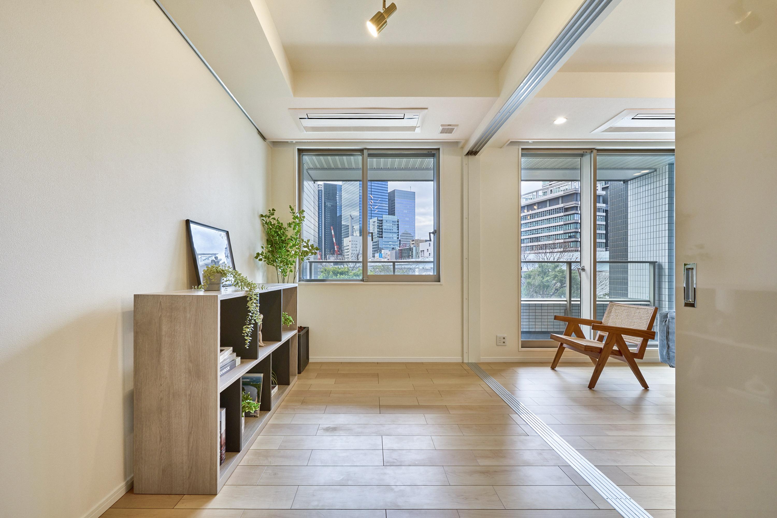インテリアコーディネーターのNです。今回は汐留・新橋エリアのダイナミズムを日常にしつつ、室内では自分を取り戻せるような「知的で落ち着いたモダン空間」を目指しました。
