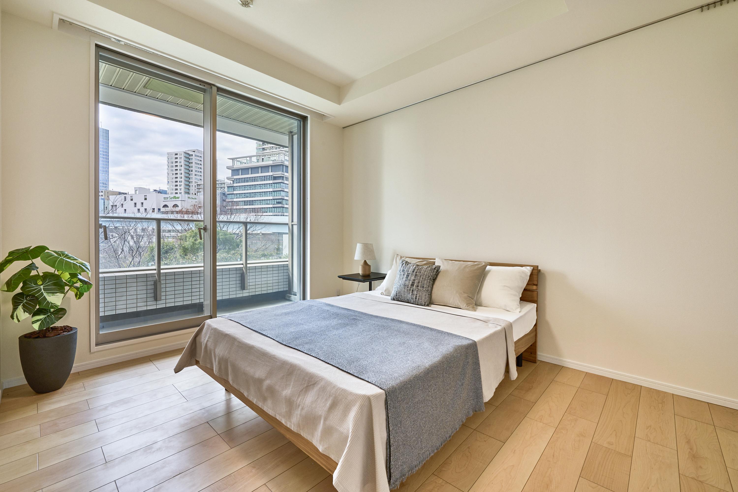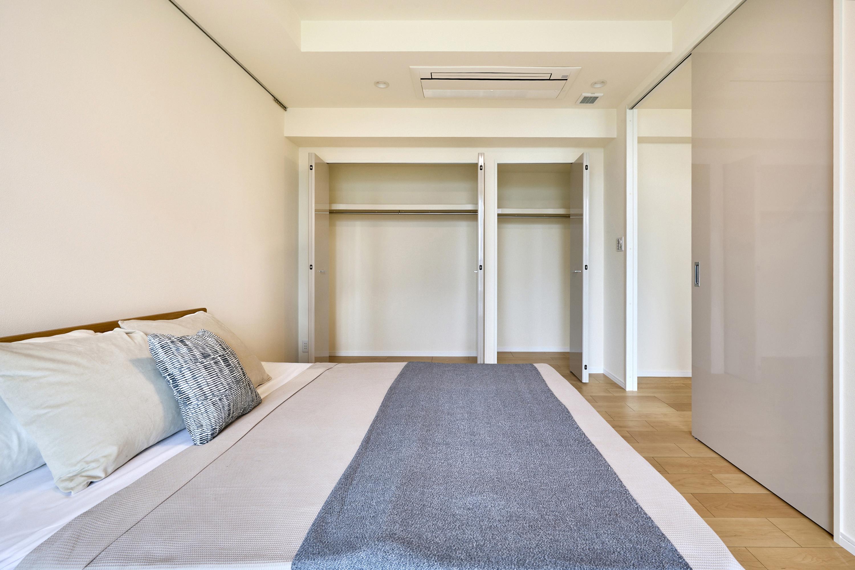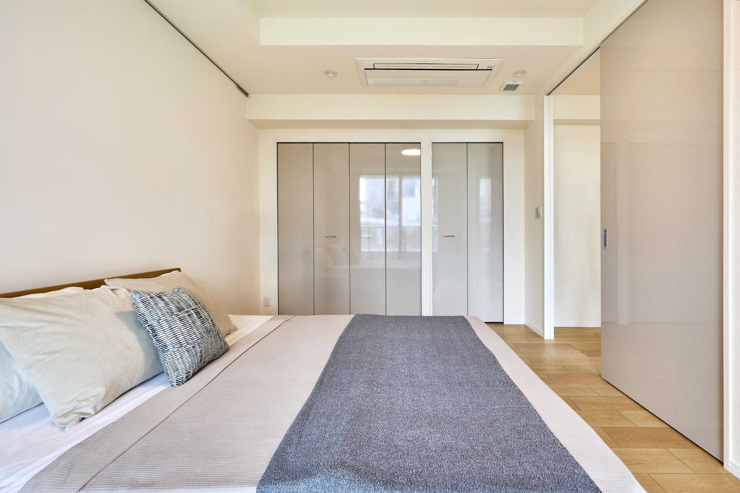 一日の疲れをリセットする場所だからこそ、装飾を削ぎ落としたミニマルな構成にしました。ダブルベッドは、温もりを感じるウッドフレームをチョイス。サイドテーブルには、スチール脚の軽やかなモデルを置き、モダンなエッセンスを忘れていません。