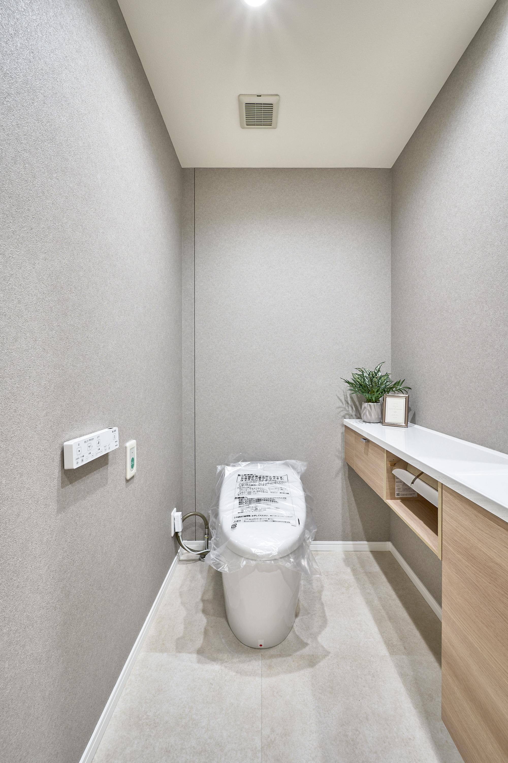 高級タワーマンションに相応しい格調高い空間にするため、小物の素材感にまでこだわっています。トイレには、あえてアートフレームや小さな多肉植物を置くことで、生活感を抑え、ホテルのようなクリーンな印象を創り出しました。