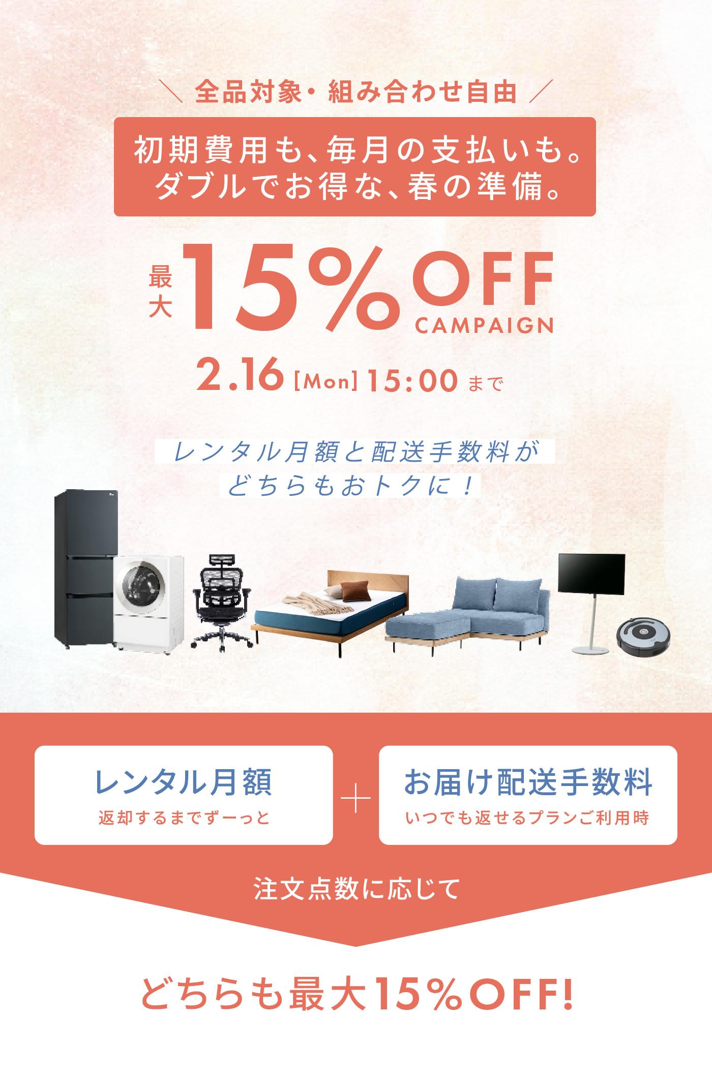 家具・家電をまとめてレンタルで、月額利用料と配送手数料がどちらも最大15%OFFになるキャンペーンを実施中です。