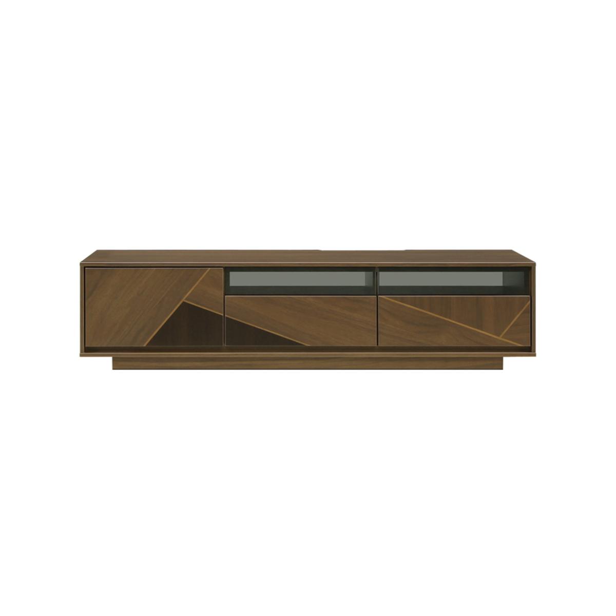 ローボードにはウォールナットを使用。チェアやラグの色をグレーで抑えて落ち着いた空間に。