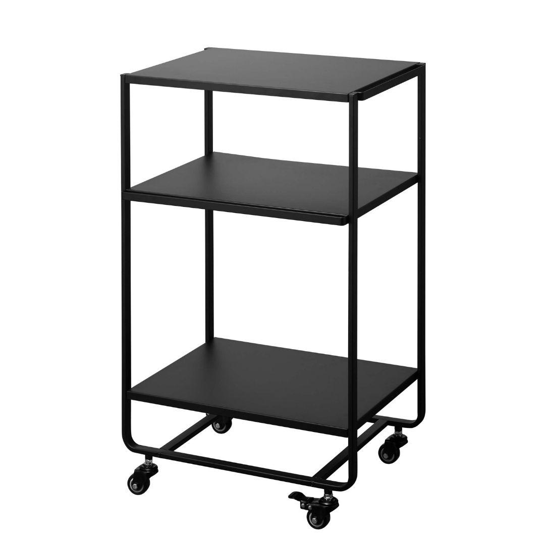 ごちゃごちゃしがちなワゴンの中も、床やテーブルの天板と合わせたナチュラルな木目のボックスやトレイを使用して収納。