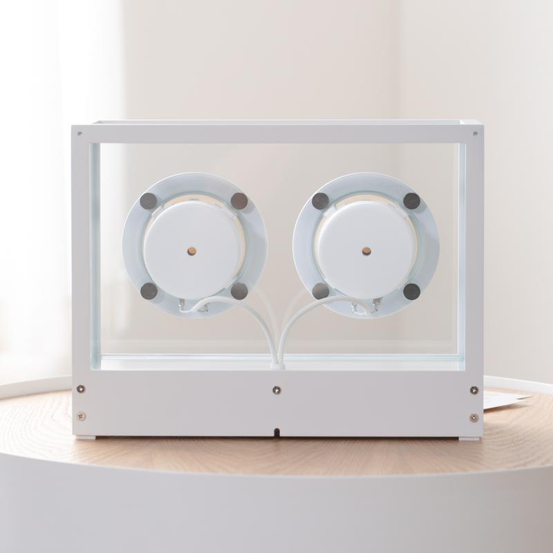 たとえばここに選んだスピーカーやデスクライトのような、ミニマルで抽象的なフォルムのアイテム。こういったものを入れると、今っぽいコーディネートになりますね。