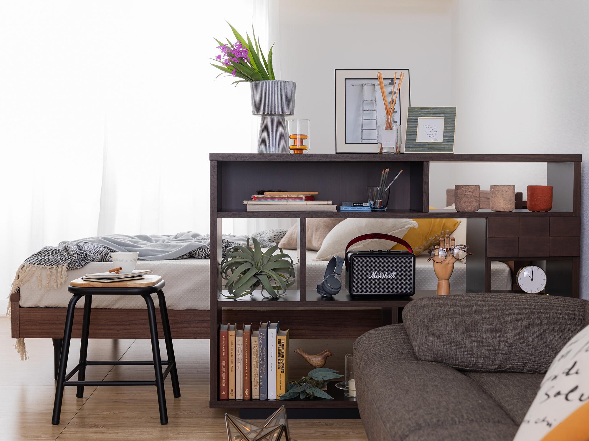 オープンラックなので、リビングと寝室どちらからでも使用できるのが便利なところ。ほどよい抜け感で、空間を遮断する圧迫感もありません。