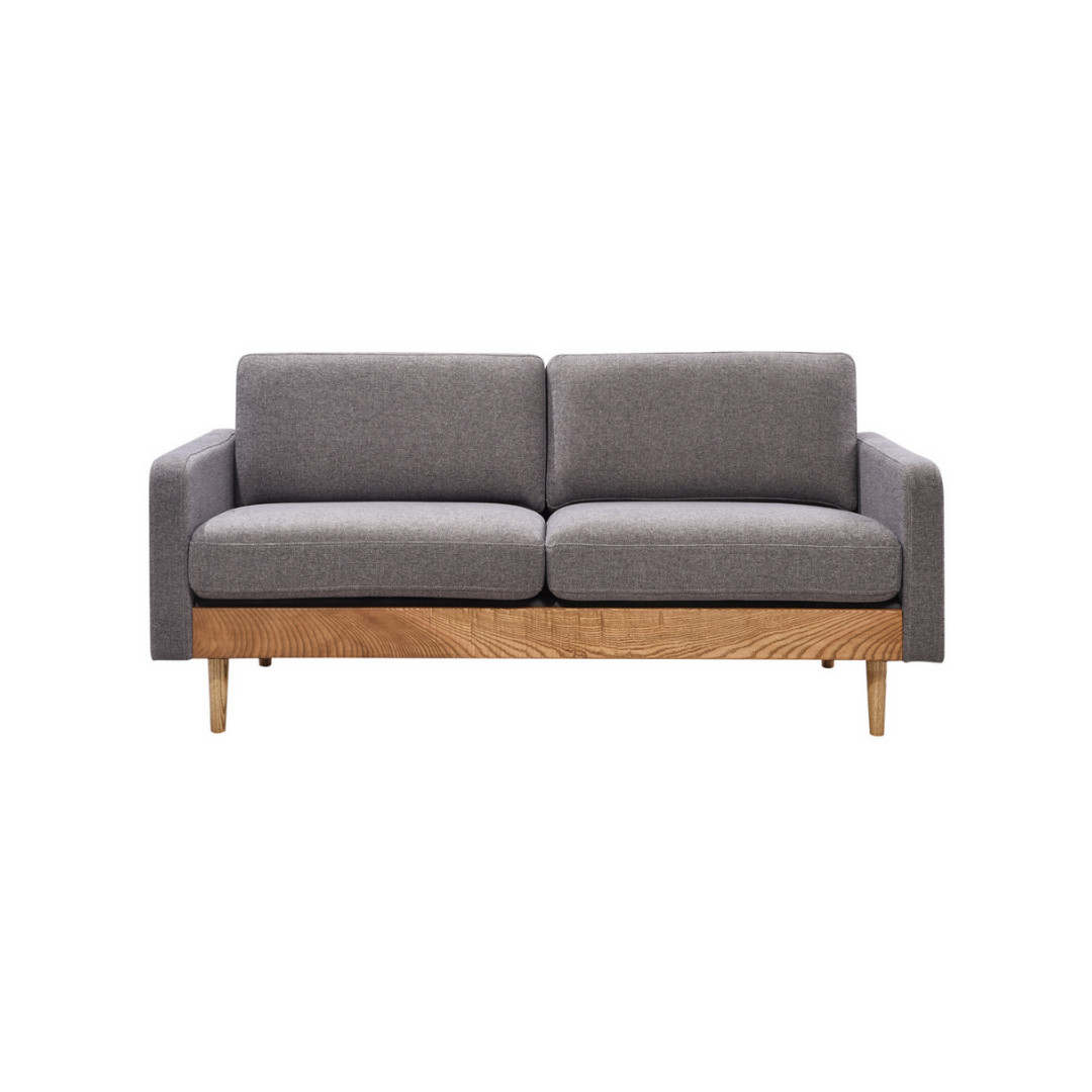 白を基調としたお部屋に合ったグレーの二人掛けソファ。